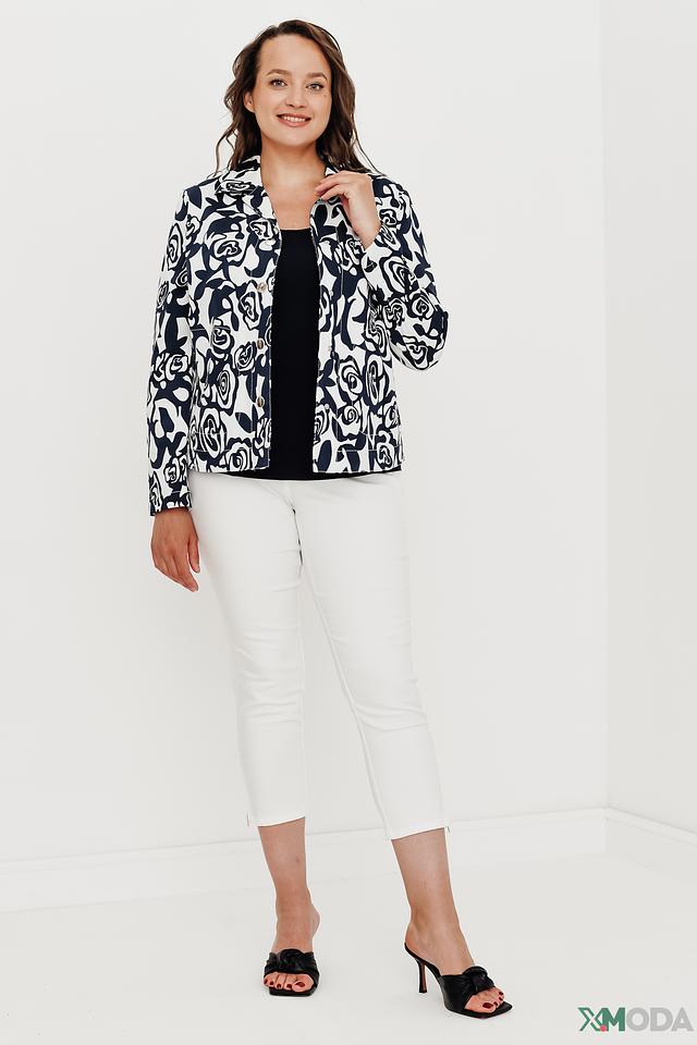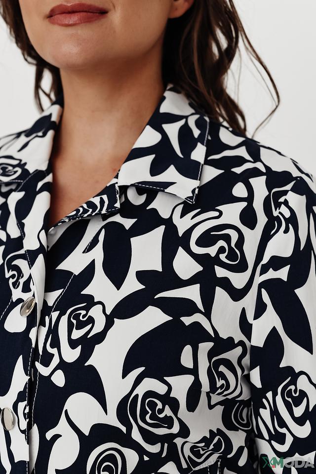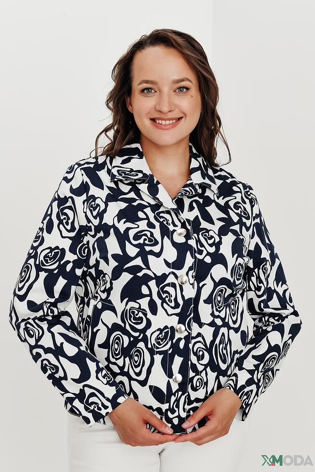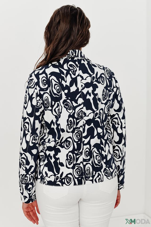 Особенностью модели является оригинальный цветочный принт в сине-белой гамме. Жакет имеет классический крой с лацканами и застежкой на пуговицы. Длинные рукава и удобная длина делают его универсальным для различных случаев.