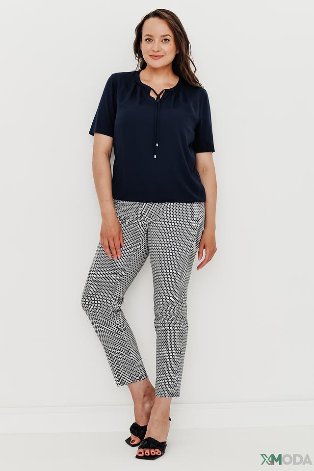 Блуза имеет прямой крой, короткие рукава и округлый вырез горловины, украшенный декоративными завязками. Эти завязки добавляют образу женственности и оригинальности.