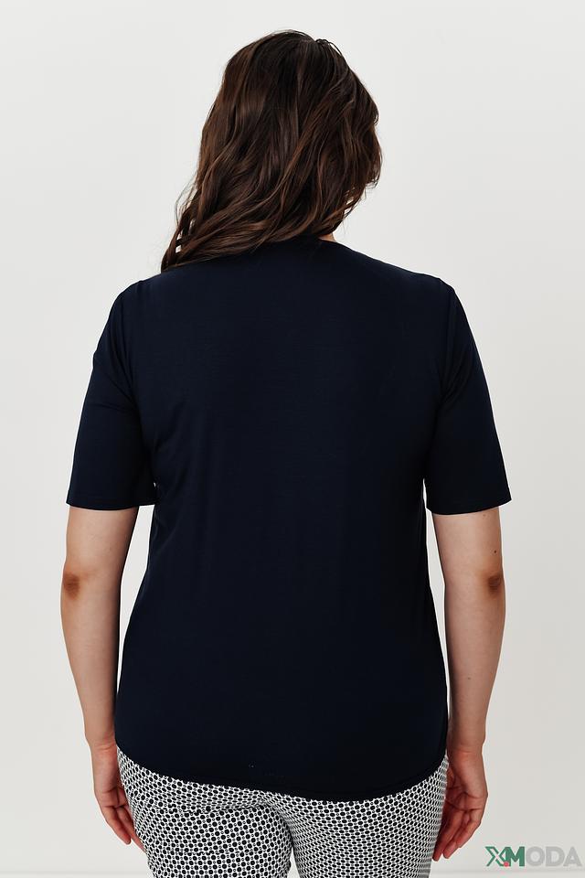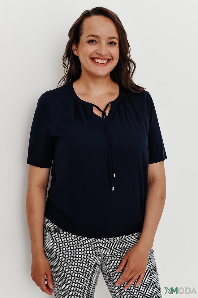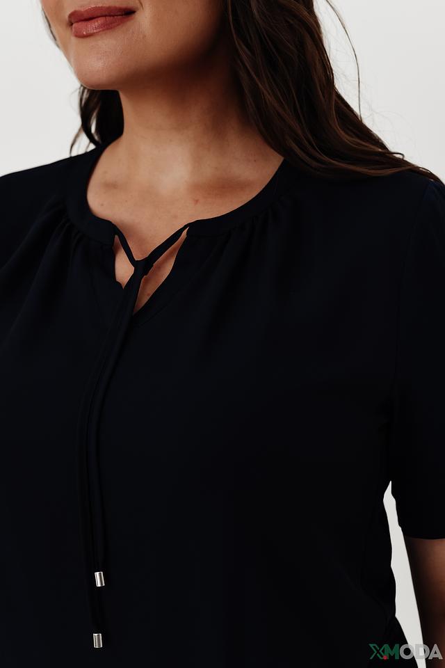 Темно-синяя блуза от Frank Walder с короткими рукавами и декоративными завязками на вырезе. Изготовлена из мягкой вискозы с добавлением эластана для комфорта и хорошей посадки. Состав: вискоза 93%, эластан 7%