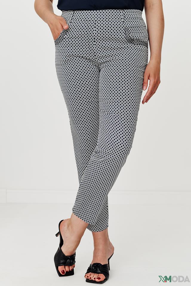 Основной цвет брюк – белый, украшен мелким чёрным горошком. Такой принт добавляет образу игривости и женственности. Брюки имеют удобную посадку на талии и оснащены боковыми карманами.