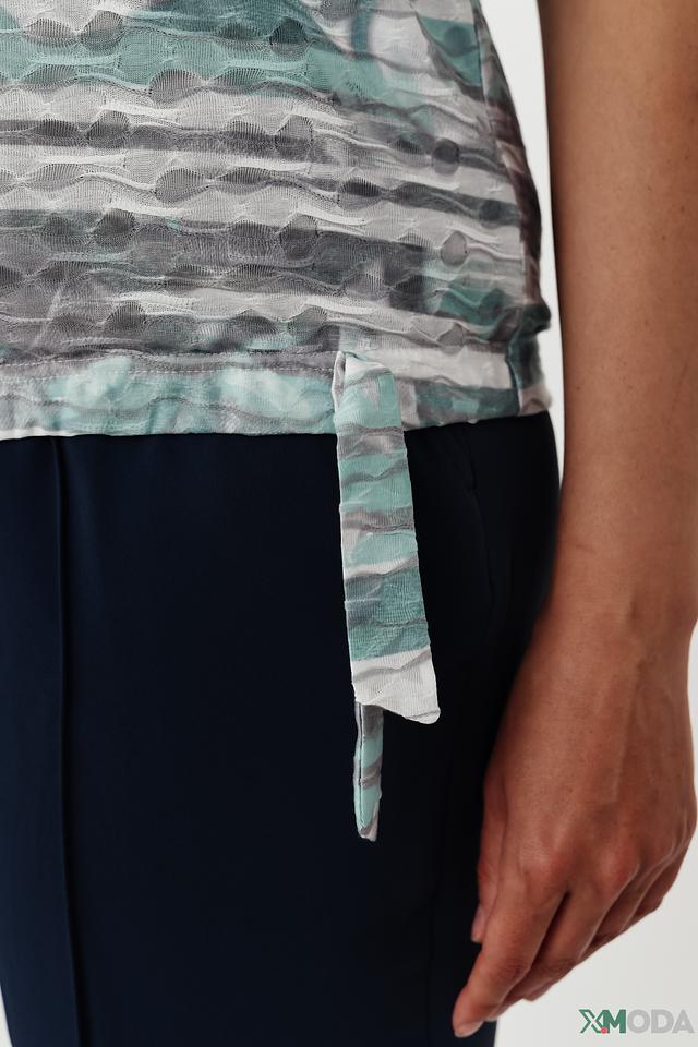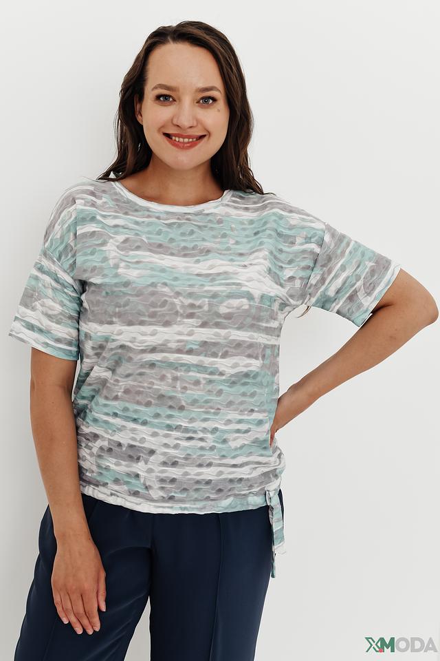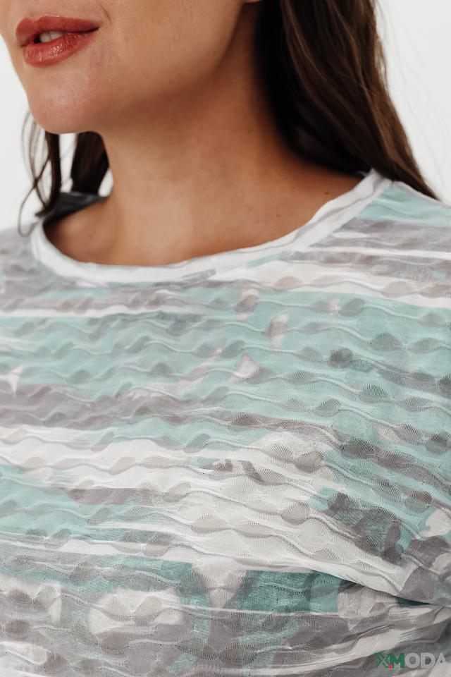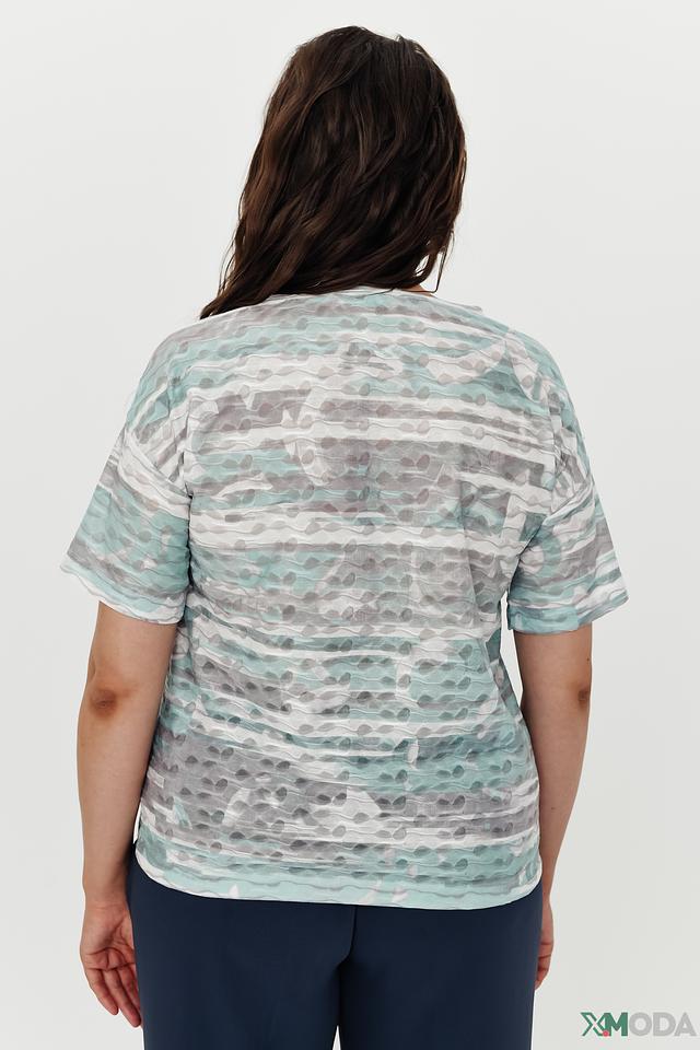 Футболка имеет свободный крой и короткие рукава, что делает её идеальной для тёплой погоды. Оригинальный принт в светло-зелёных, серых и белых тонах придаёт ей особый шарм и индивидуальность.