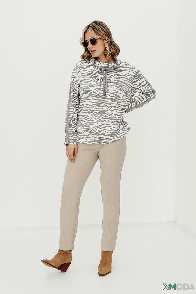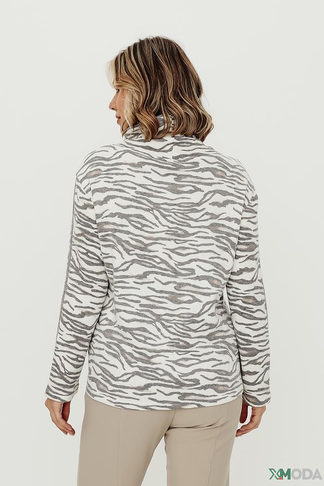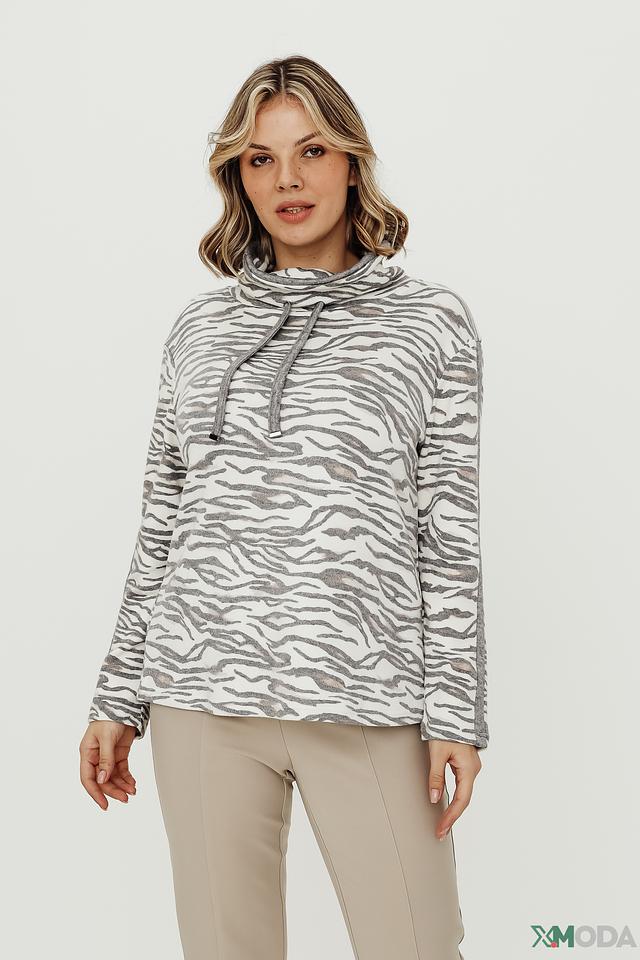Дизайн пуловера выполнен в актуальном стиле с принтом "зебра", который добавляет образу динамичности и оригинальности. Высокий воротник с завязками создает уютный и стильный силуэт.