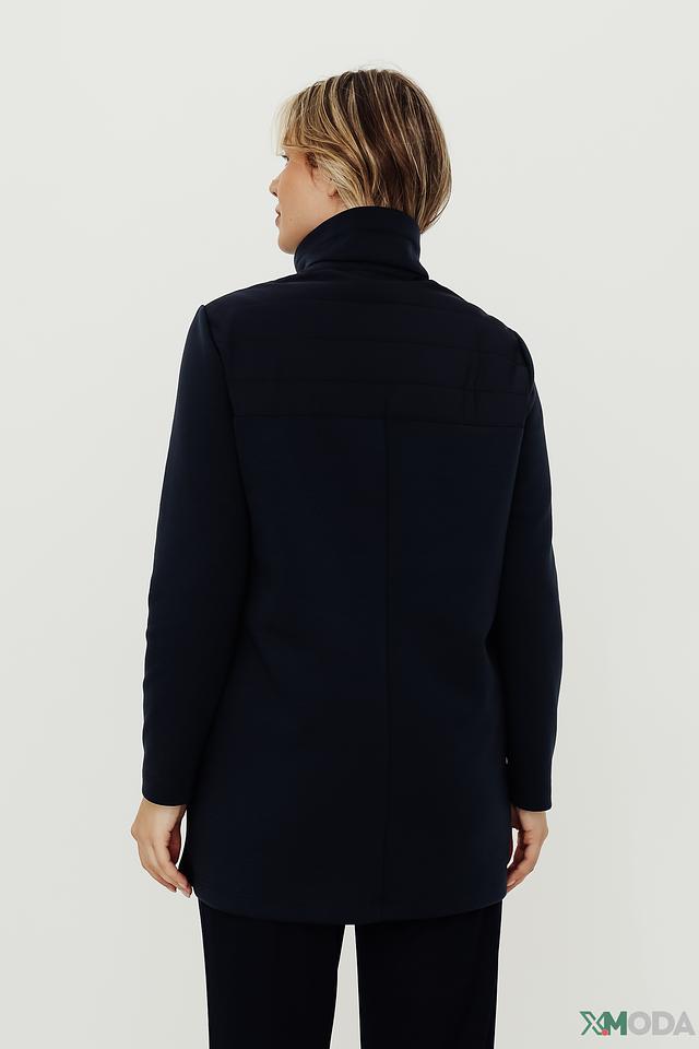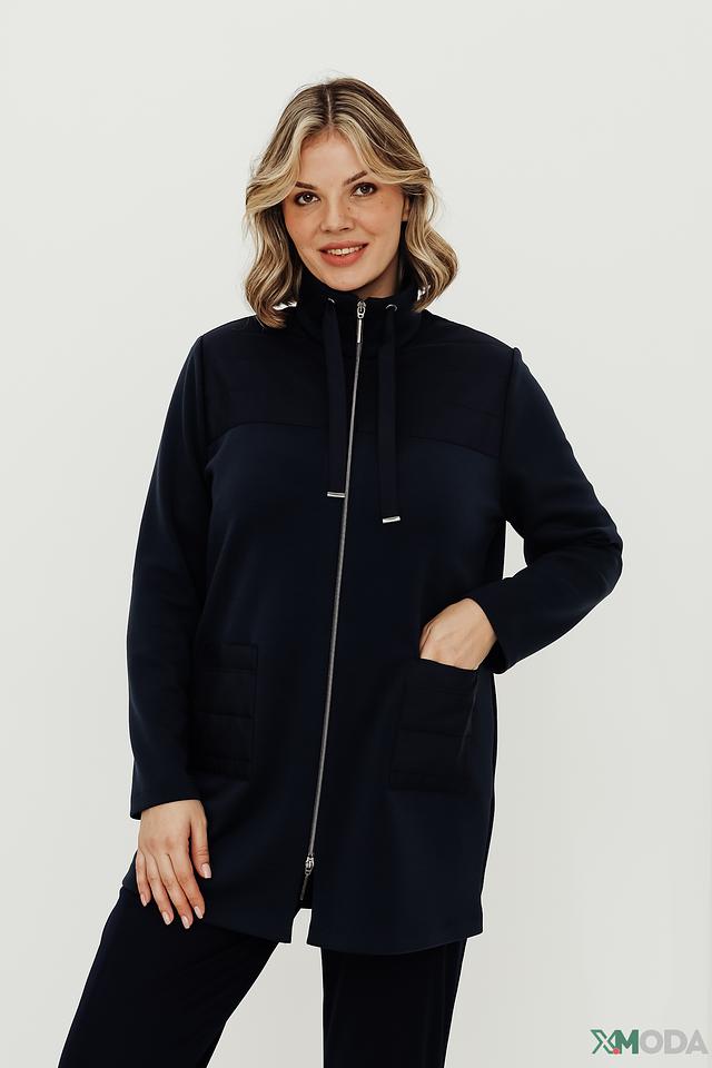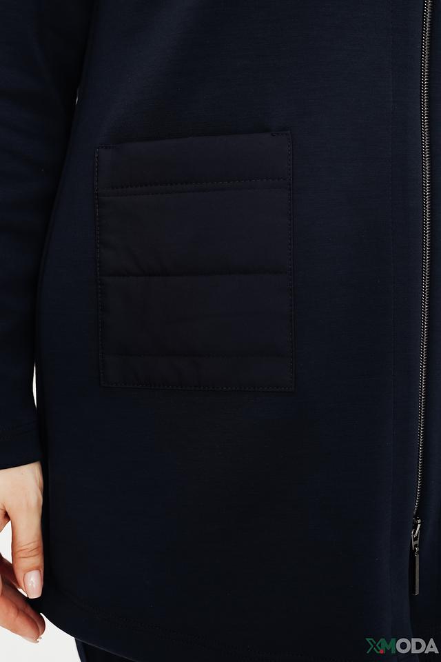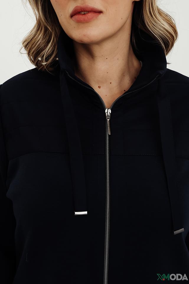 Жакет имеет приталенный силуэт, который подчеркивает фигуру, и застегивается на молнию. Капюшон добавляет практичности и защищает от непогоды. Модель дополнена функциональными карманами.