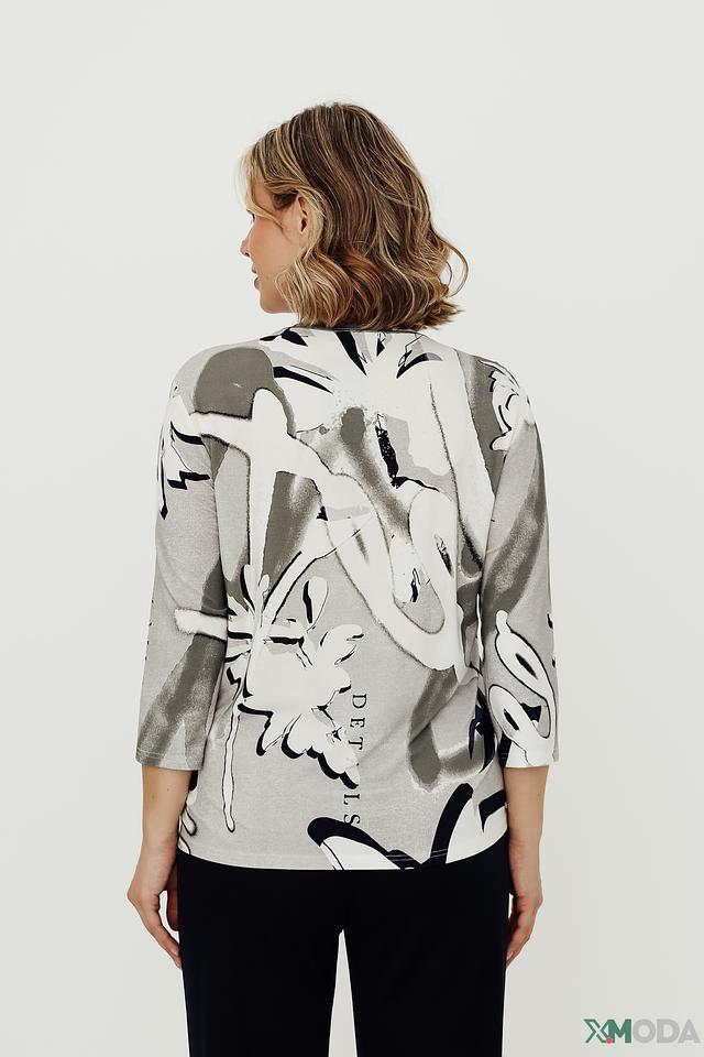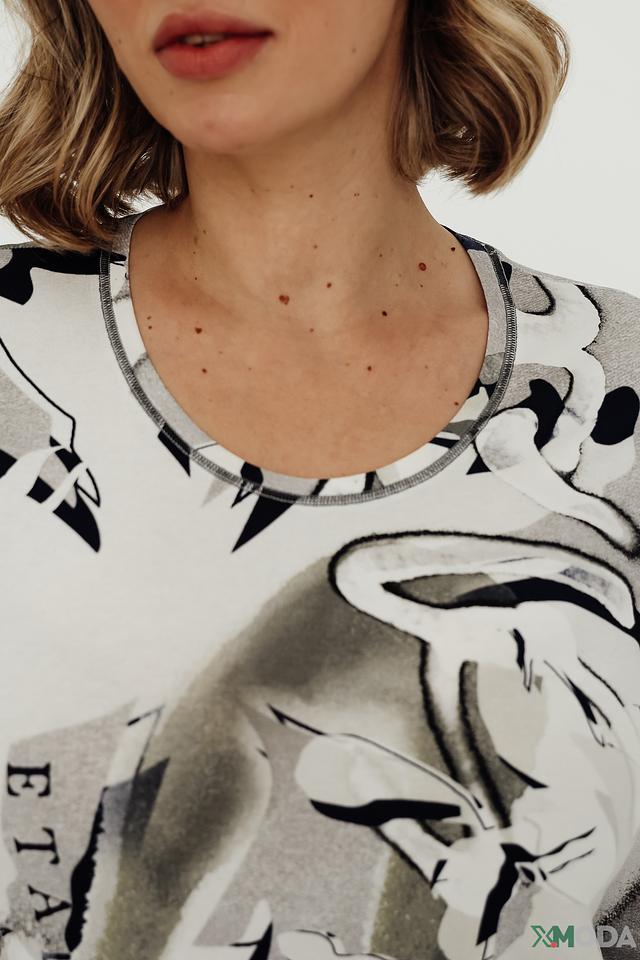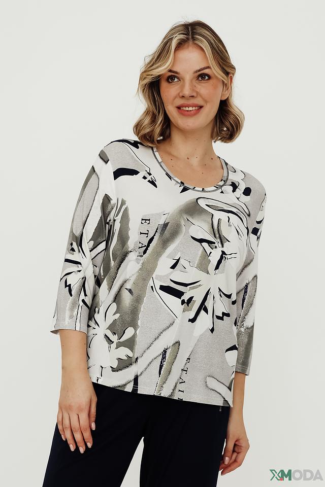 Блуза имеет прямой крой и короткий рукав 3/4, что делает ее универсальной для любого времени года. Особенностью модели является яркий цветочный принт в серых тонах, который добавляет образу оригинальности и свежести.