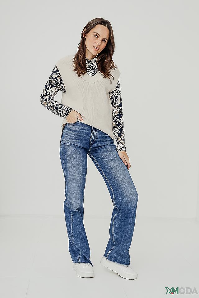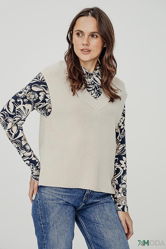 Модель имеет классический V-образный вырез и прямой, слегка свободный крой, обеспечивающий комфорт в носке. Жилет идеально подходит для создания многослойных образов, его можно носить поверх рубашки или блузки, а также как самостоятельный элемент гардероба.