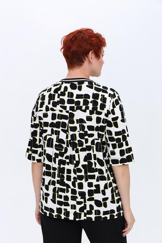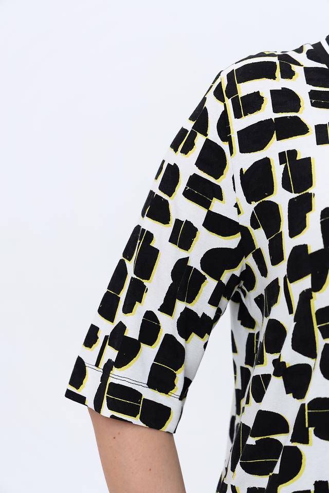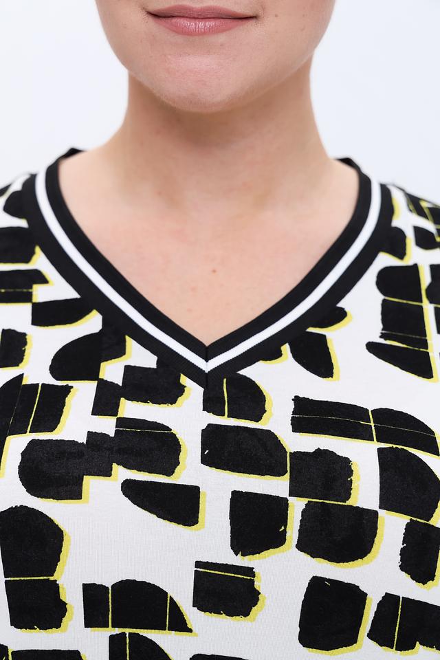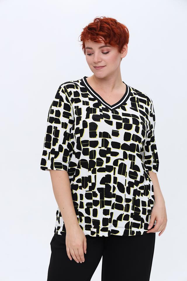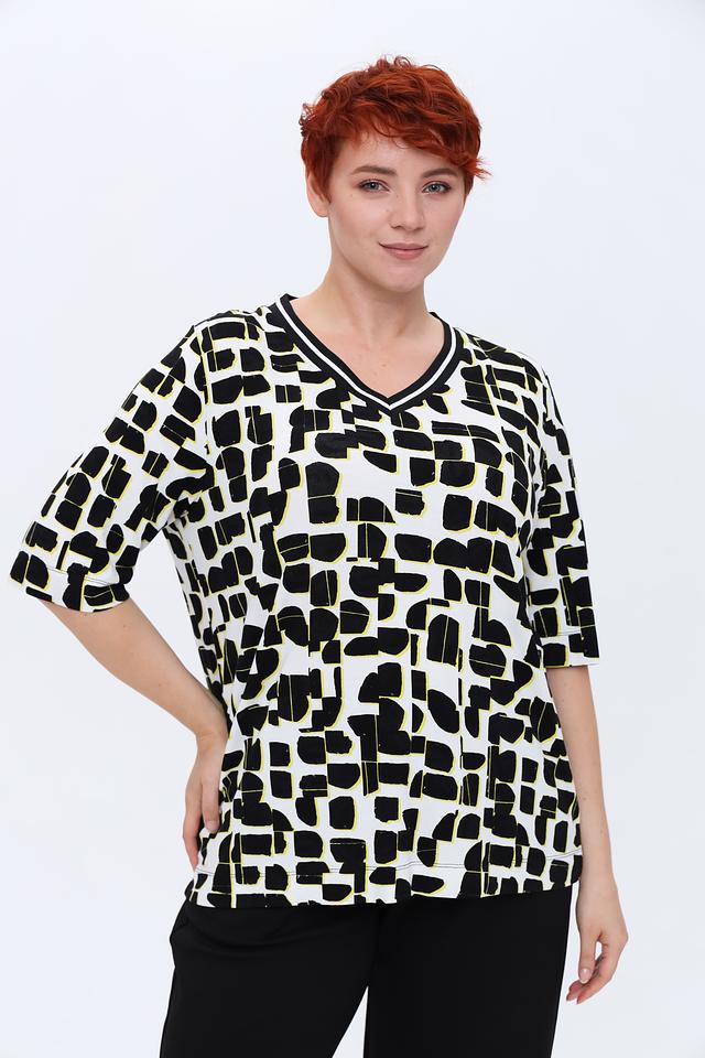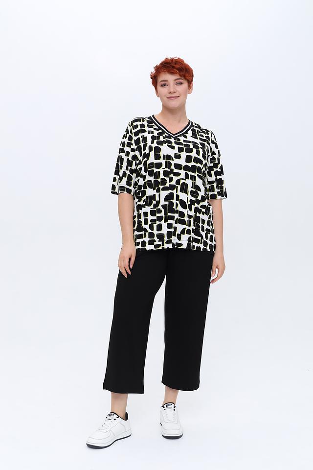 Особенностью этой футболки является оригинальный принт в виде абстрактных чёрных фигур на белом фоне. Такая расцветка легко сочетается с различными элементами гардероба, позволяя создавать разнообразные образы. Состав: 90% вискоза, 10% эластан.