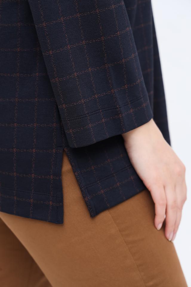 Эта блуза от Frapp – идеальный выбор для создания элегантного и непринужденного образа. Выполнена в темно-синем цвете с мелким клетчатым принтом, который добавляет изысканности.