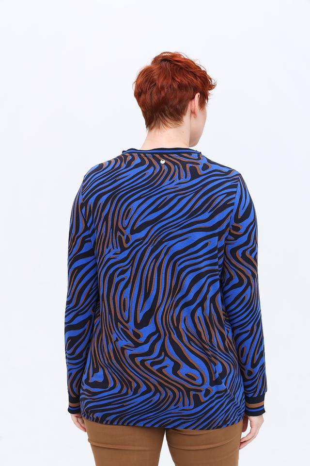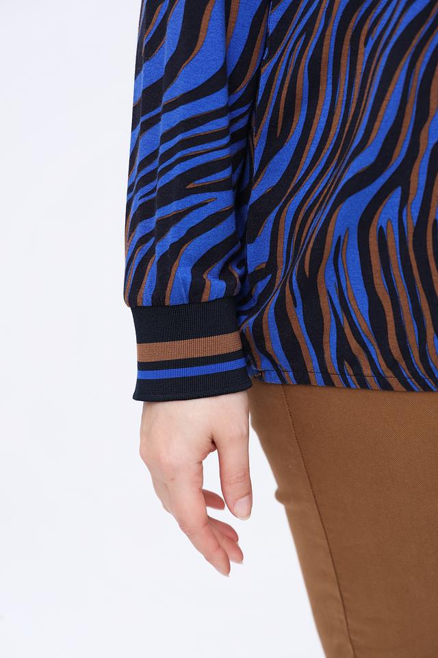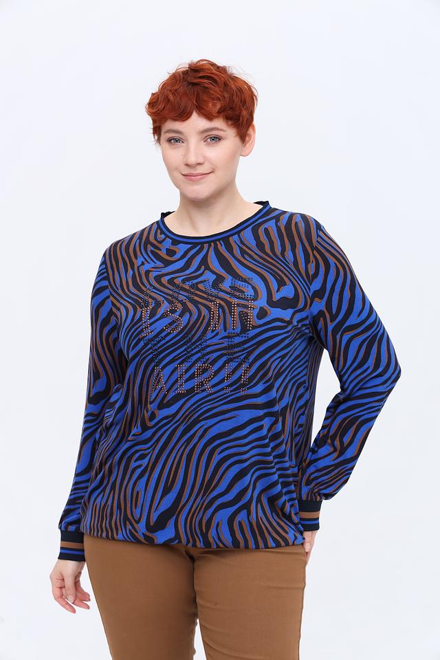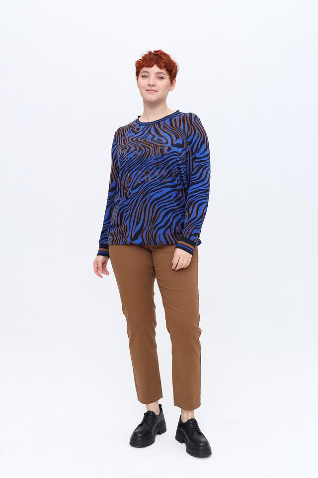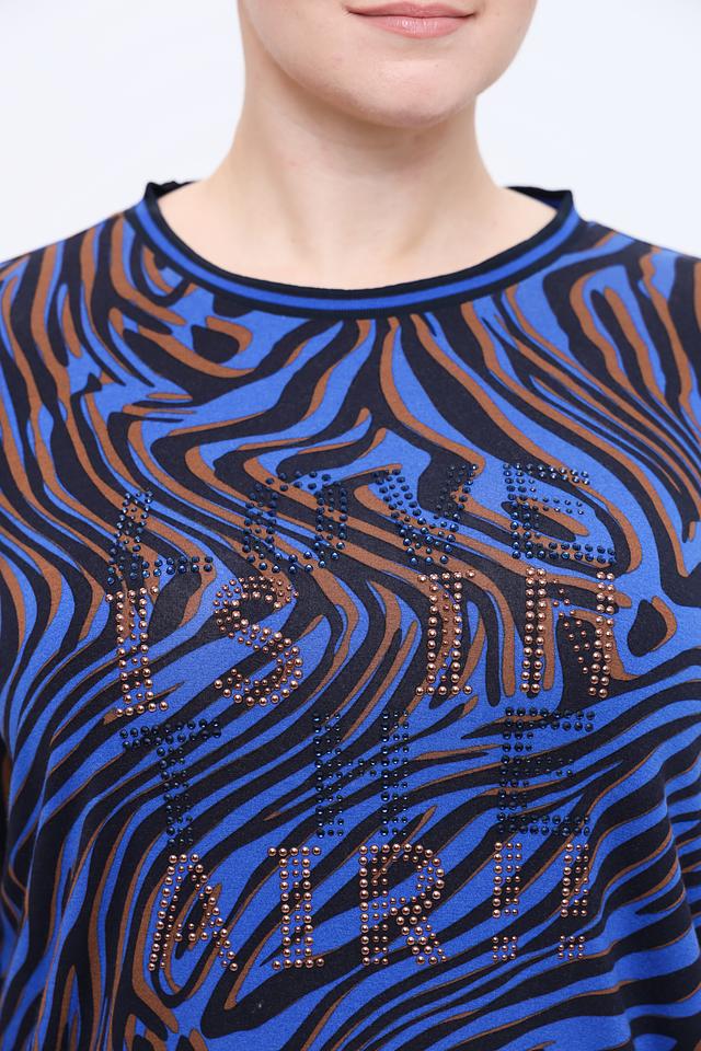 Лонгслив имеет яркий и запоминающийся принт в виде "зебры", выполненный в сочетании синих и коричневых оттенков. Декоративные элементы в виде страз добавляют изделию изысканности и привлекательности.