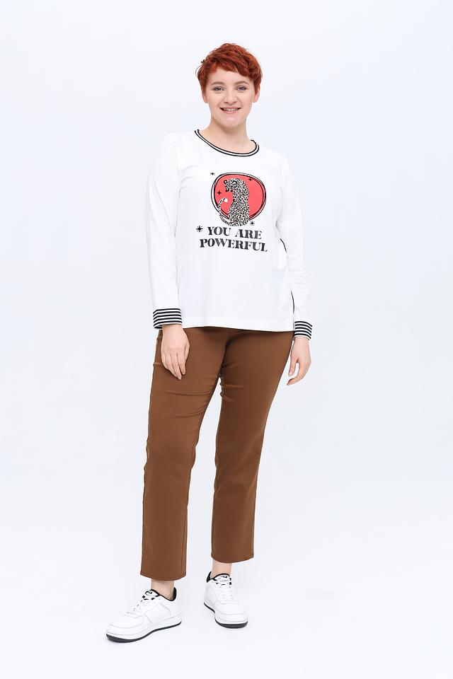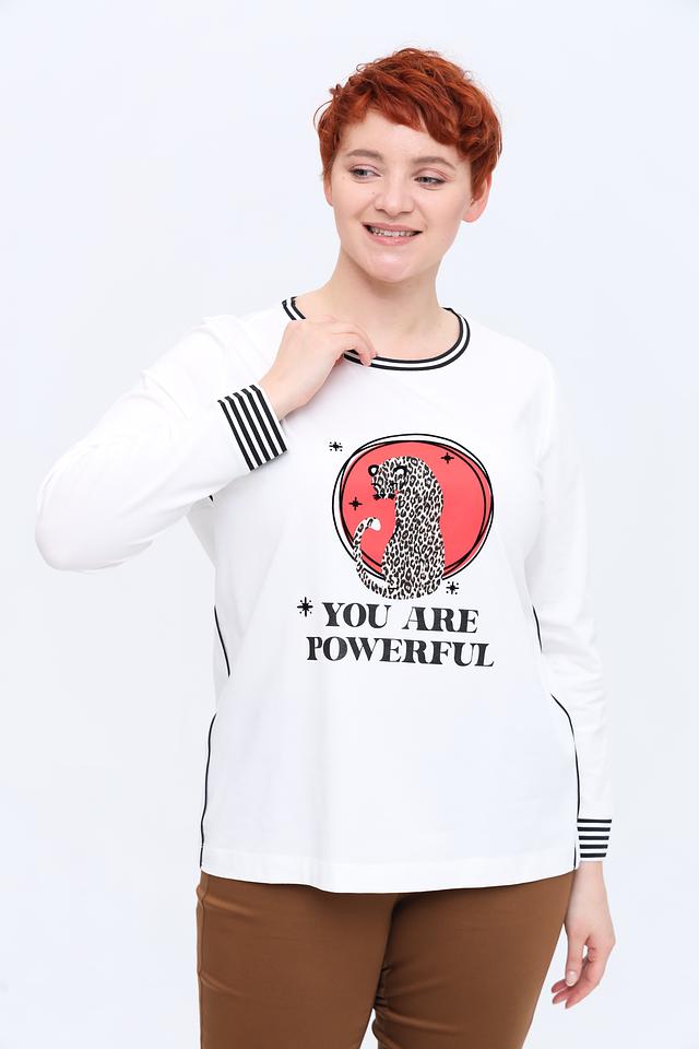Белый лонгслив от Frapp с ярким принтом леопарда и надписью "YOU ARE POWERFUL". Изготовлен из мягкого хлопка с добавлением эластана для комфорта и свободы движений. Отличный выбор для создания стильного и уверенного образа. Состав: хлопок 92%, эластан 8%