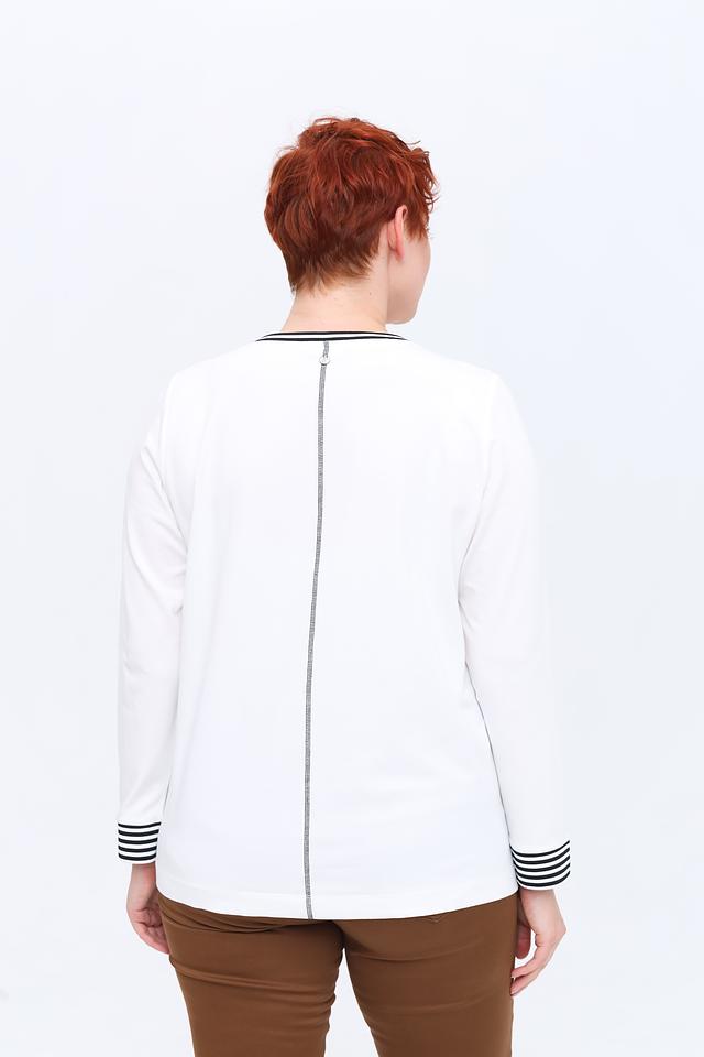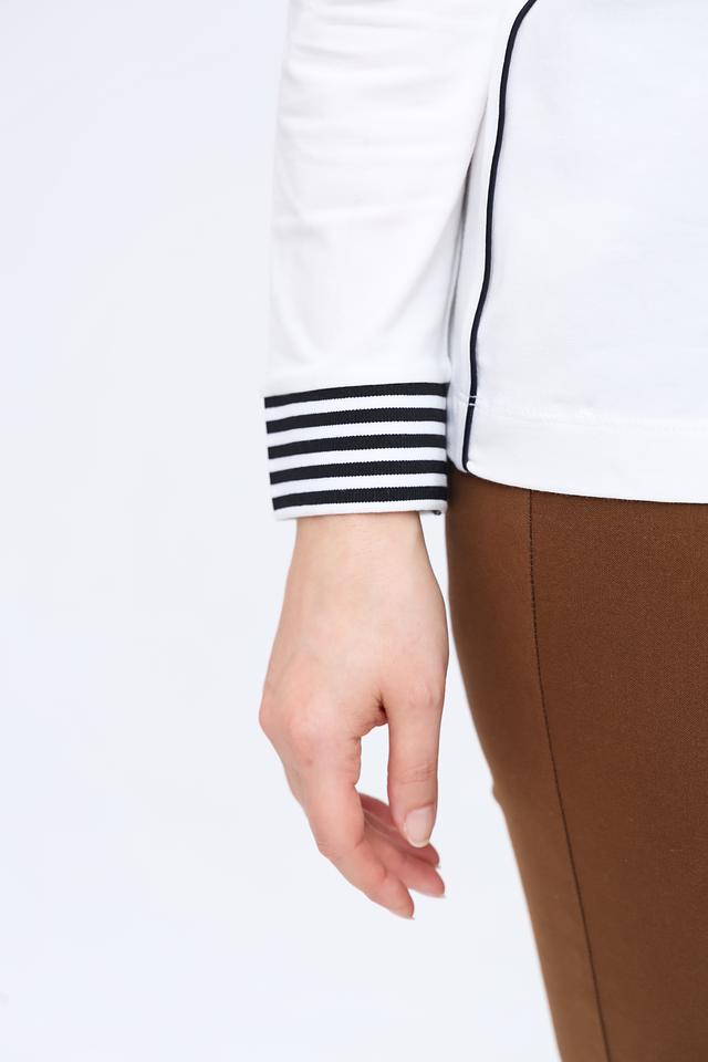 Лонгслив имеет прямой крой, длинные рукава и круглый вырез горловины, отделанный черной полоской. Манжеты рукавов также оформлены черными полосками, что добавляет контрастности и динамики образу. Спинка лонгслива украшена вертикальной черной полосой.