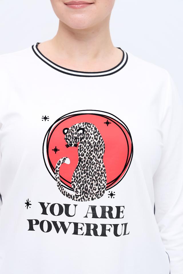 Этот стильный лонгслив от бренда Frapp станет отличным дополнением к вашему гардеробу. Выполненный в белом цвете, он украшен ярким принтом леопарда в красном круге и мотивирующей надписью "YOU ARE POWERFUL".