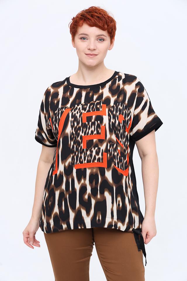 Основной принт блузы – леопардовый, выполненный в коричнево-бежевой гамме. На передней части изделия расположена яркая оранжевая вставка с графичным дизайном, которая добавляет блузе оригинальности и динамики.