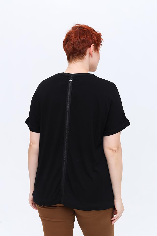 Блуза имеет свободный крой, короткие рукава и круглый вырез горловины. Сзади предусмотрена декоративная шнуровка, которая придает модели дополнительный акцент. Состав ткани: 90% вискоза, 10% эластан.
