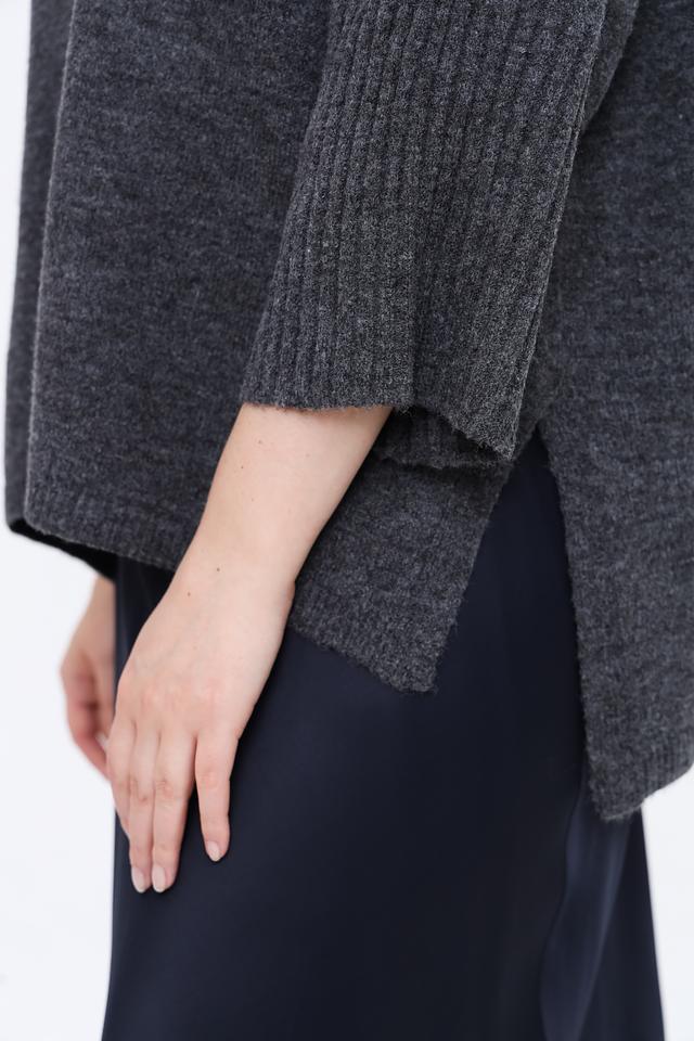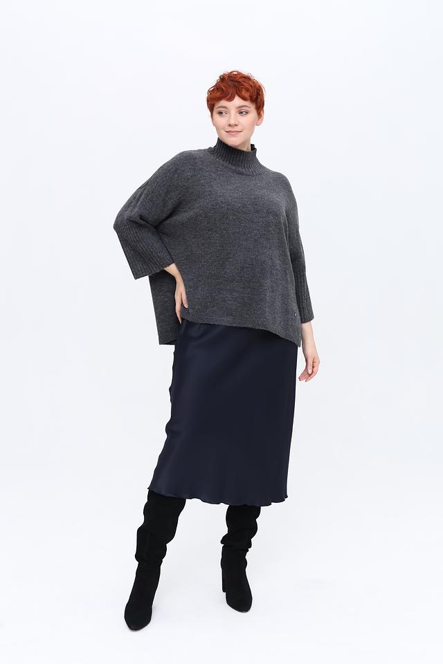 Пуловер имеет свободный, слегка заниженный крой, что обеспечивает комфорт в носке и позволяет создавать различные образы. Рукава 3/4 с вязаным манжетом добавляют изысканности. Асимметричный подол придает модели оригинальность.
