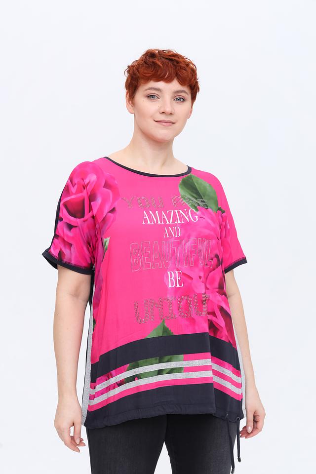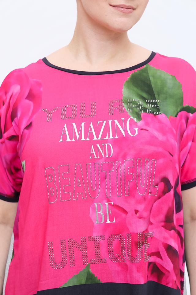 Яркая блуза Frapp фуксии с эффектным цветочным принтом и контрастными вставками. Модель свободного кроя с короткими рукавами и декоративной полосой на спине станет стильным дополнением к вашему гардеробу. Состав: вискоза 90%, эластан 10%