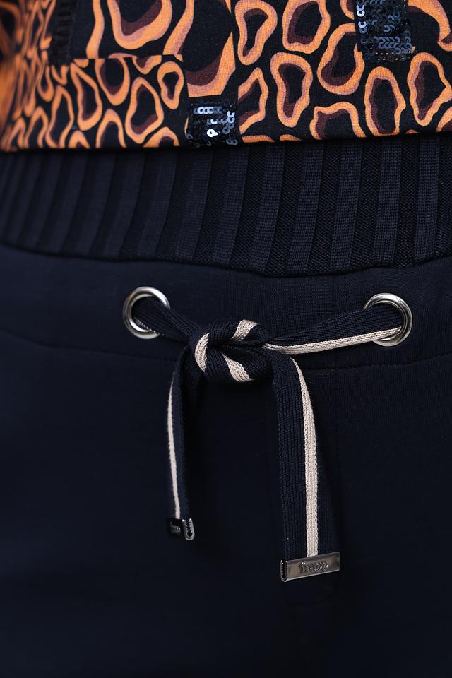 Темно-синие брюки Frapp — это стильные кюлоты с удобной посадкой и эластичным поясом. Модель дополнена декоративными элементами и шнурком на талии, что придает ей современный вид. Состав: полиэстер 56%, вискоза 38%, эластан 6%