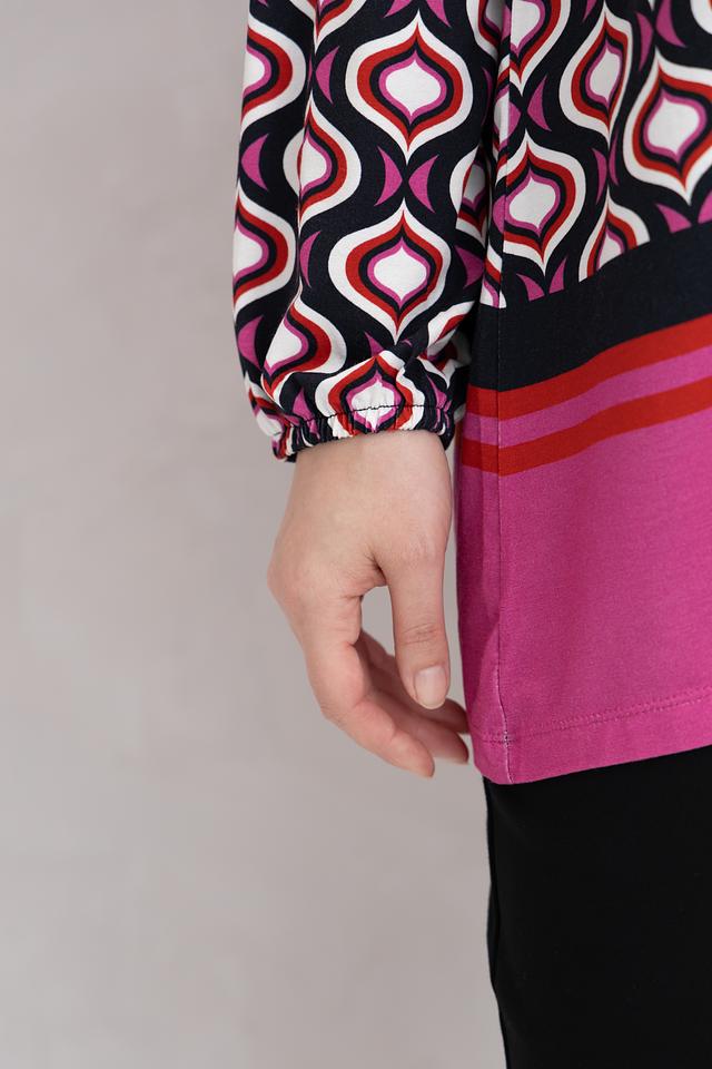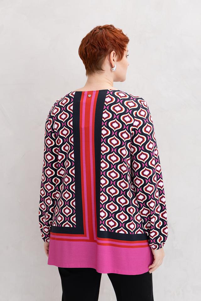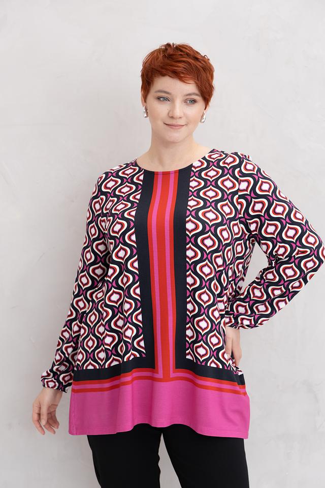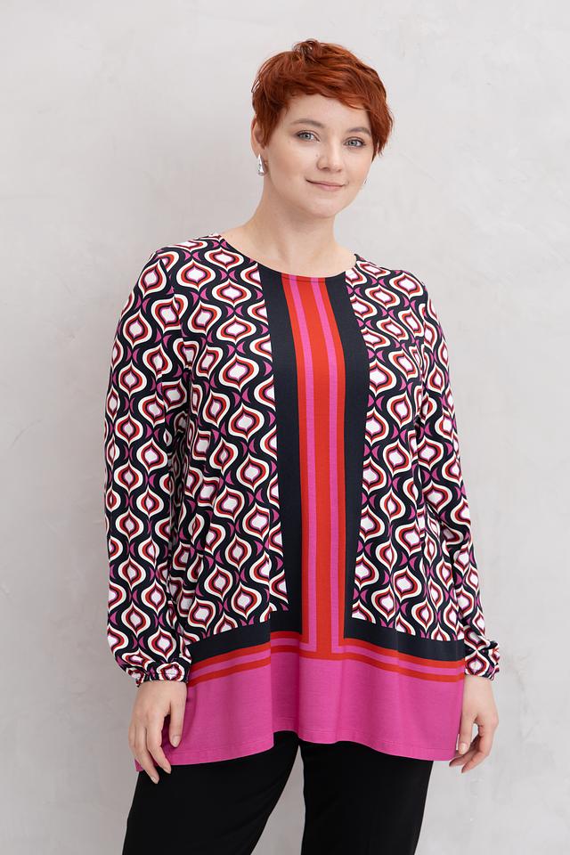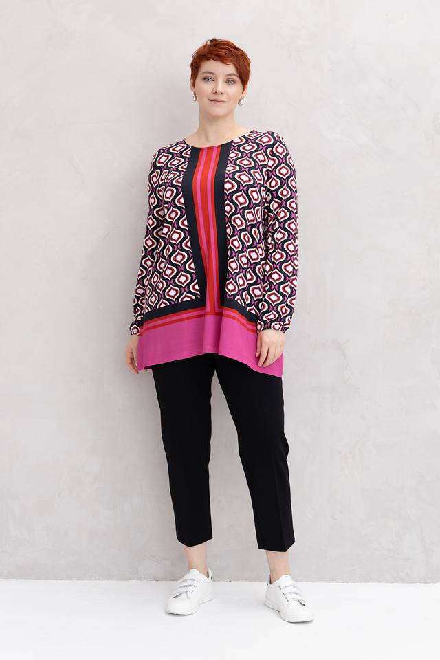 Блузка украшена ярким геометрическим принтом, который придает ей динамичный и современный вид. Центральная вертикальная полоса и контрастный низ визуально вытягивают силуэт, делая фигуру более стройной. Длинные рукава с манжетами и удобный круглый вырез горловины завершают классический крой этой женской блузки.