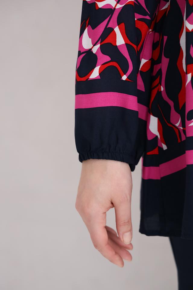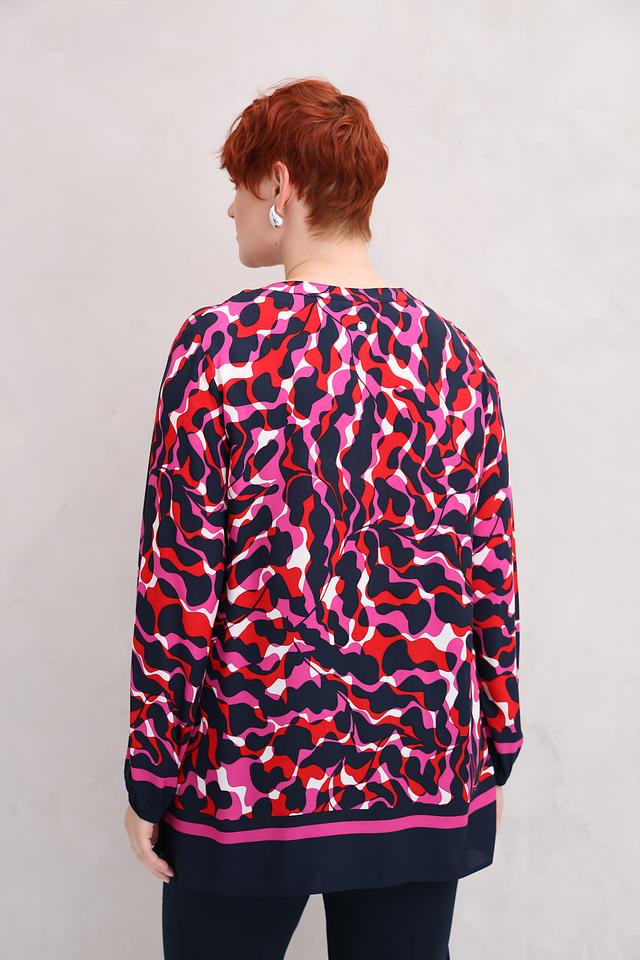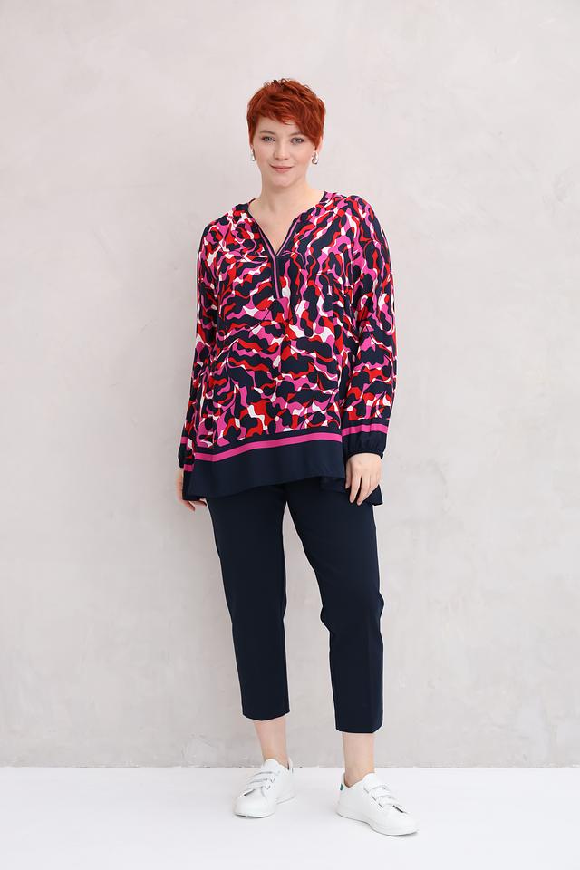 Принт с абстрактными узорами в ярких оттенках делает эту блузу уникальной и привлекательной. Она отлично сочетается с брюками, юбками и джинсами, позволяя создавать разнообразные стильные образы. Блуза идеально подойдет для повседневной носки, а также для особых случаев.
