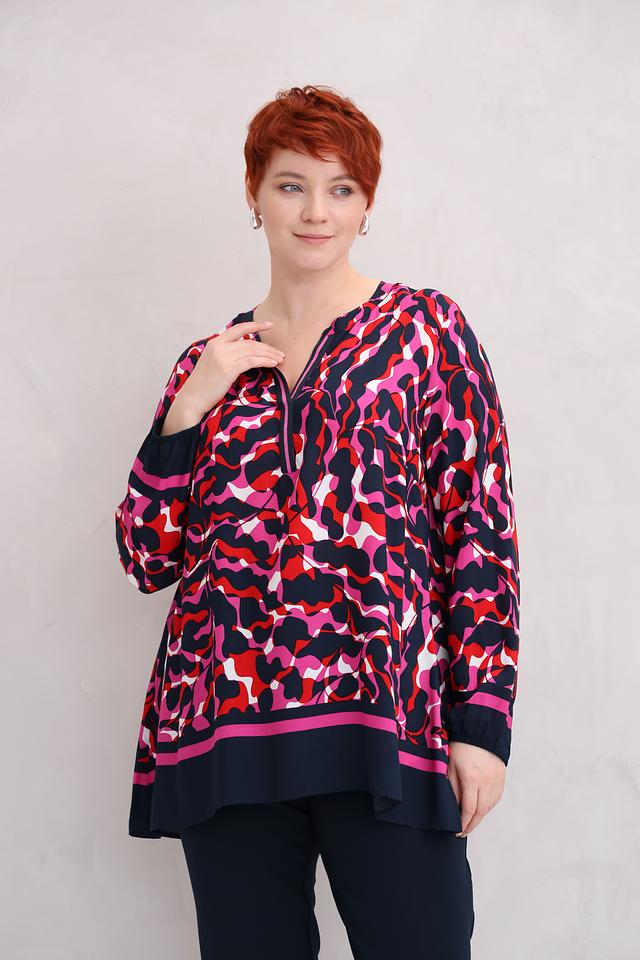 Особенности модели: свободный крой, V-образный вырез, короткий воротник-стойка, яркий принт, 100% вискоза.