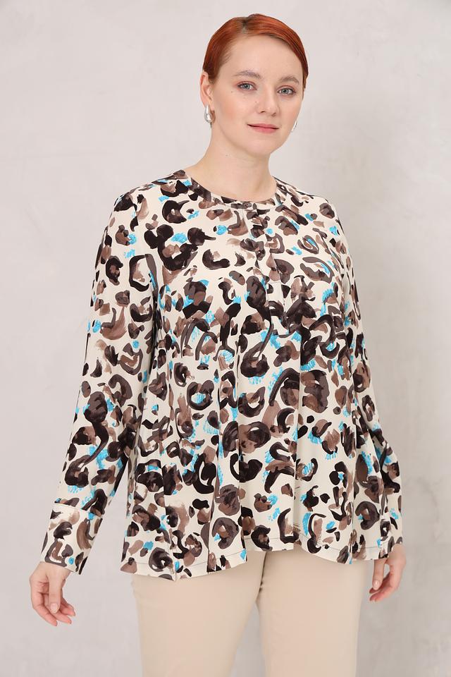 Модель имеет свободный крой, который обеспечивает комфорт и свободу движений. Длинные рукава и округлый вырез горловины делают эту блузу универсальной и подходящей для различных случаев.