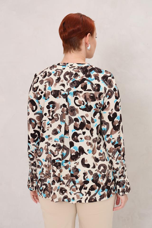 Эта блуза от Frapp – отличный выбор для создания повседневного и элегантного образа. Блуза выполнена в бежевых тонах и украшена абстрактным принтом, сочетающим в себе оттенки коричневого, голубого и серого.