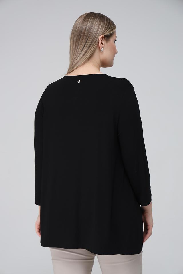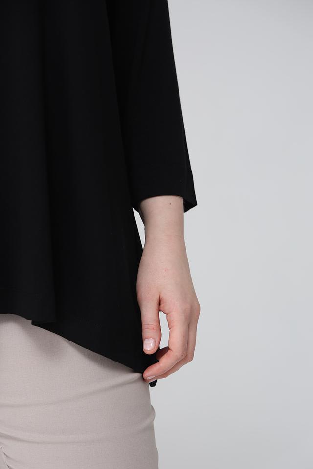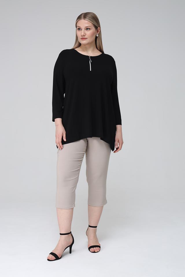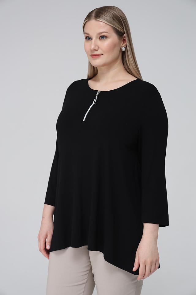Блуза имеет округлый вырез горловины, украшенный короткой молнией, что добавляет ей оригинальности. Фасон блузы слегка занижен, что обеспечивает свободу движений и создает расслабленный силуэт.