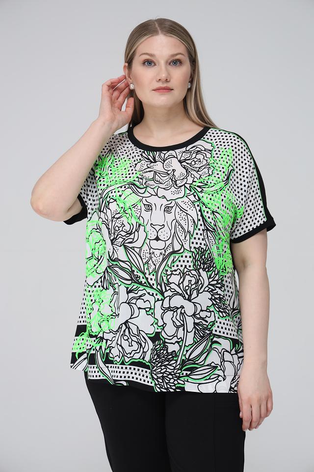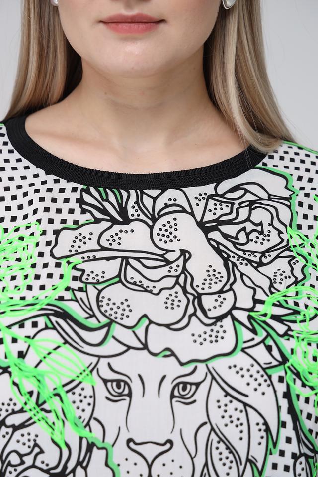 Блуза Frapp белого цвета с ярким принтом льва и геометрическим узором станет стильным дополнением вашего гардероба. Модель свободного кроя выполнена из мягкой вискозы с добавлением эластана для комфорта. Состав: вискоза 90%, эластан 10%