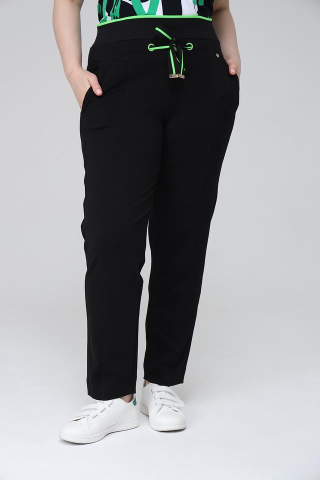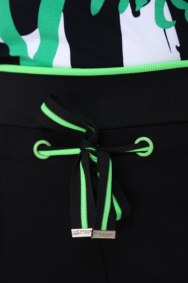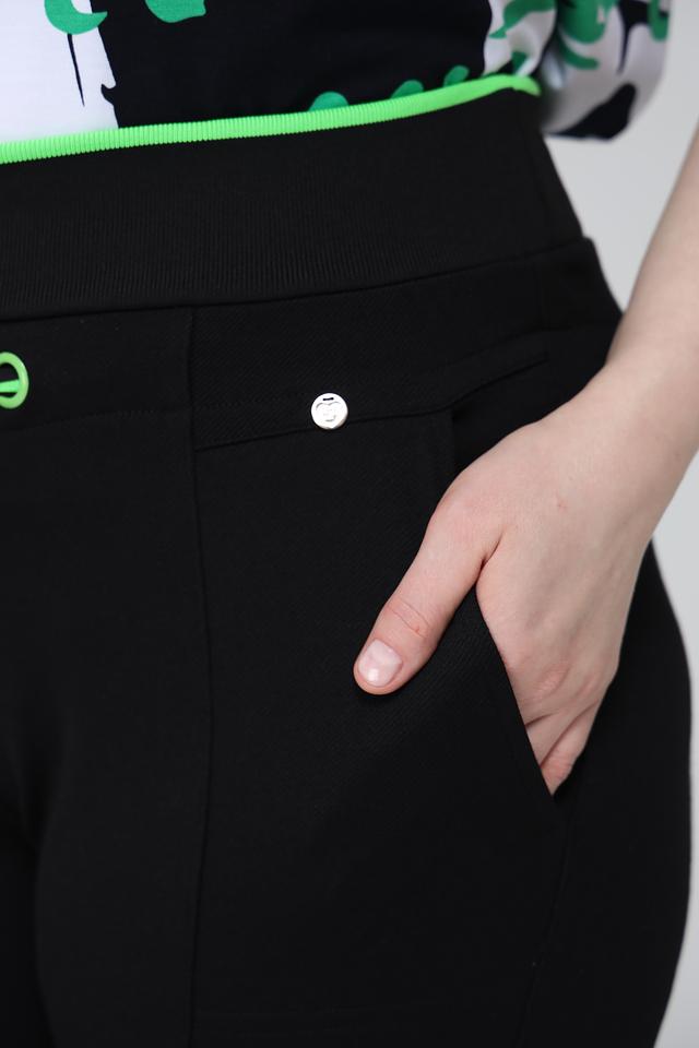 Особенностью модели являются декоративные завязки на талии, выполненные в зелёном цвете, которые позволяют подчеркнуть силуэт и добавить образу индивидуальности. Брюки имеют стандартную посадку и прямой крой, что делает их подходящими для разных типов фигуры. Удобные карманы по бокам добавляют функциональности.
