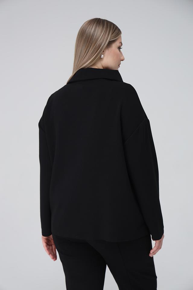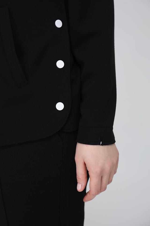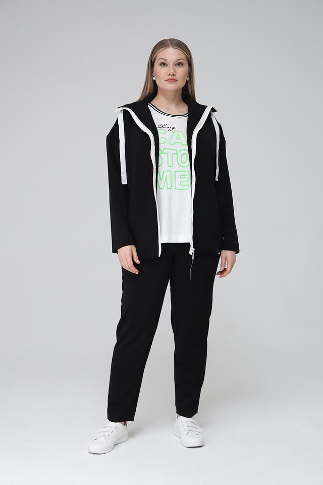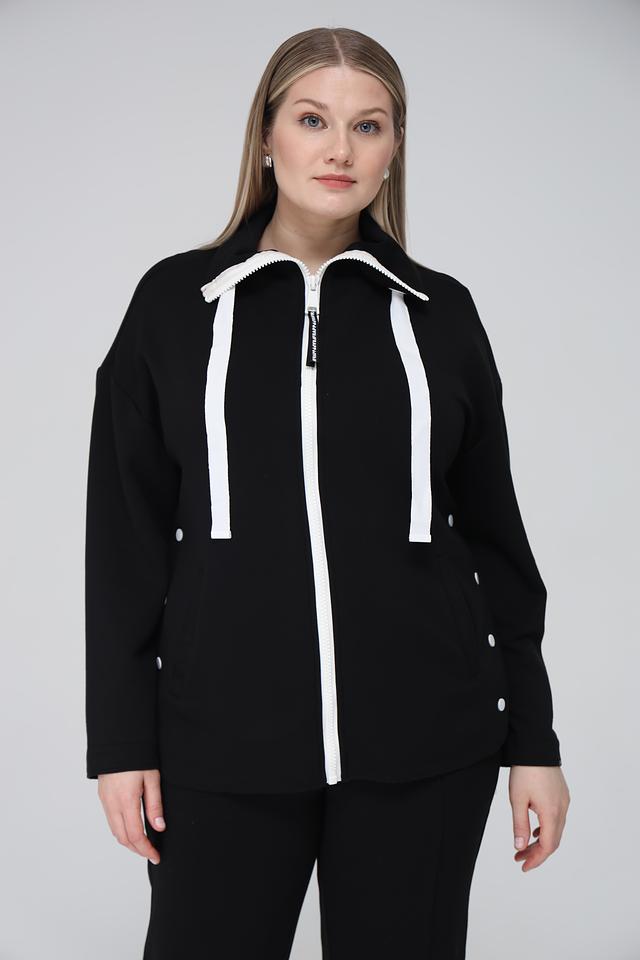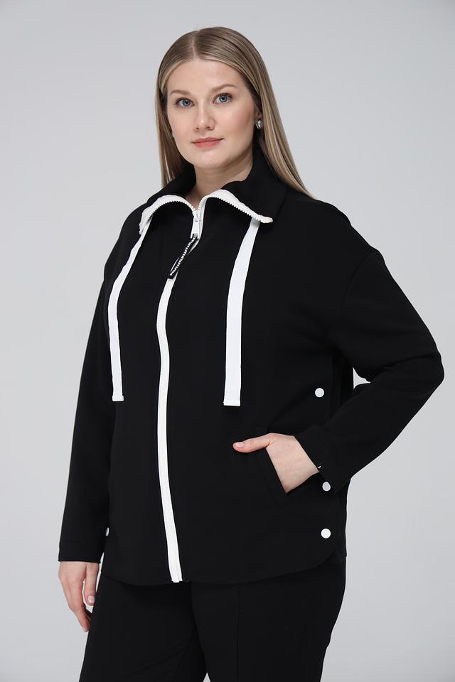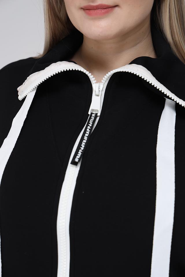 Чёрный жакет Frapp с застёжкой на молнию и белой отделкой – стильное и удобное решение для создания повседневных образов. Модель выполнена из мягкой вискозы с добавлением полиэстера и эластана, обеспечивающих комфорт и свободу движений. Состав: вискоза 49%, полиэстер 43%, эластан 8%