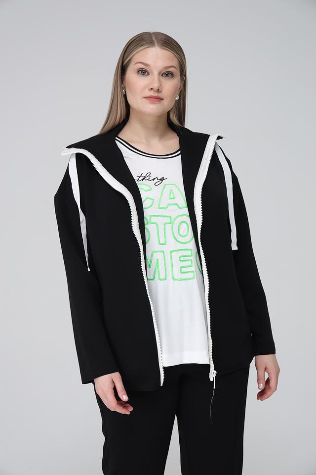 Жакет имеет удобную застёжку на молнию, которая обрамлена контрастной белой окантовкой. Белая полоса проходит по всей длине молнии, создавая эффектный акцент. Капюшон также имеет белую отделку, что добавляет модели динамичности.