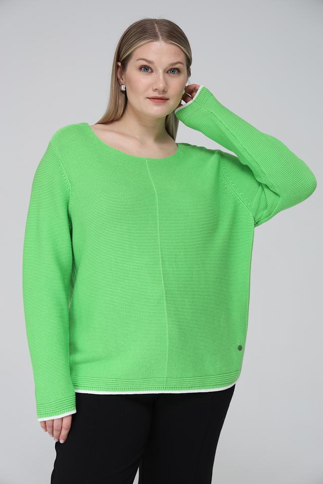 Женский пуловер Frapp лаймового цвета с округлым вырезом и белой отделкой по горловине и низу. Изготовлен из мягкого хлопка, обеспечивающего комфорт в носке. Стильный и удобный выбор для повседневного гардероба. Состав: хлопок 100%