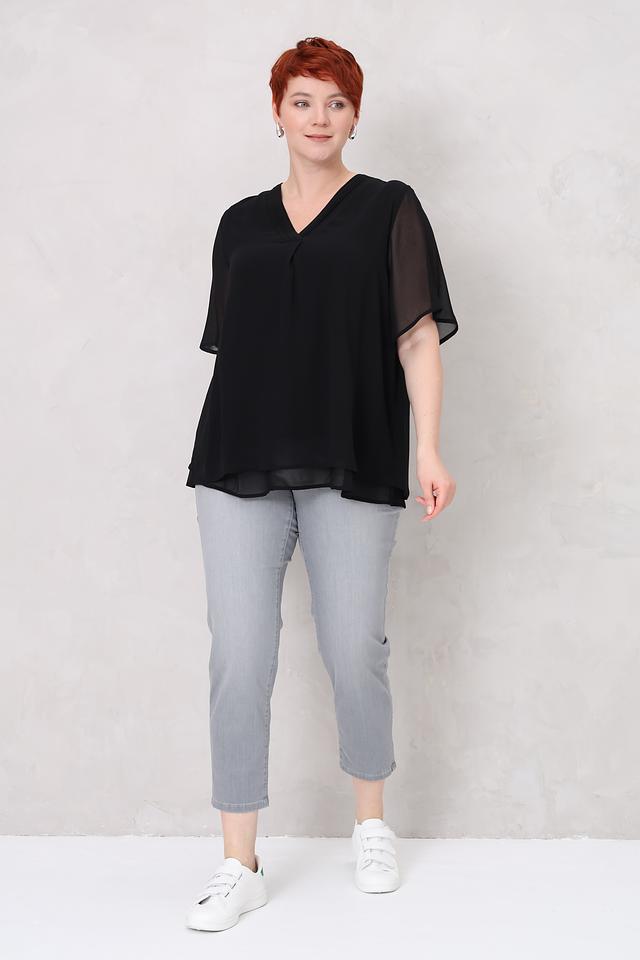 Блуза имеет свободный крой, который обеспечивает комфорт в носке и не сковывает движения. V-образный вырез горловины визуально удлиняет шею и подчеркивает женственность силуэта. Короткие рукава-воланы придают блузе лёгкость и романтичность.