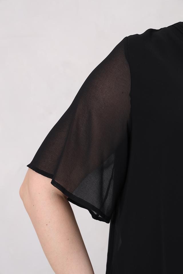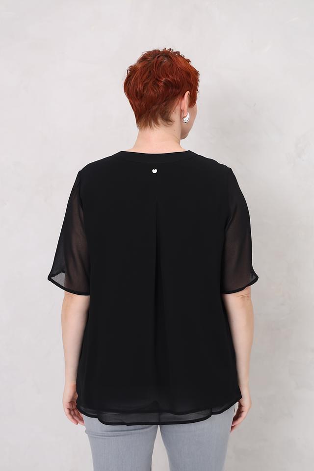 Чёрная блуза Frapp свободного кроя с короткими рукавами-воланами. Модель выполнена из лёгкой ткани и имеет V-образный вырез горловины, что придает ей элегантный и женственный вид. Состав: полиэстер 100%