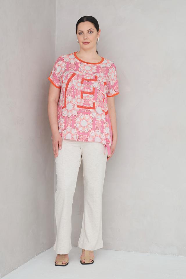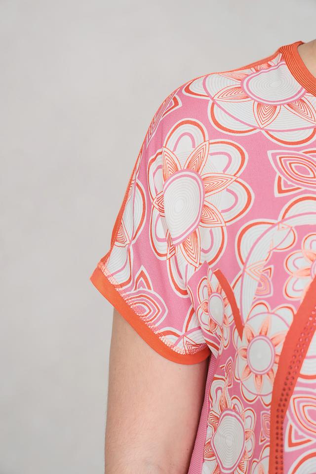 Футболка имеет прямой крой, короткие рукава и круглый вырез горловины, отделанный контрастной оранжевой окантовкой. Главная особенность модели – эффектный цветочный принт в нежных оттенках розового и оранжевого, дополненный геометрическими элементами.