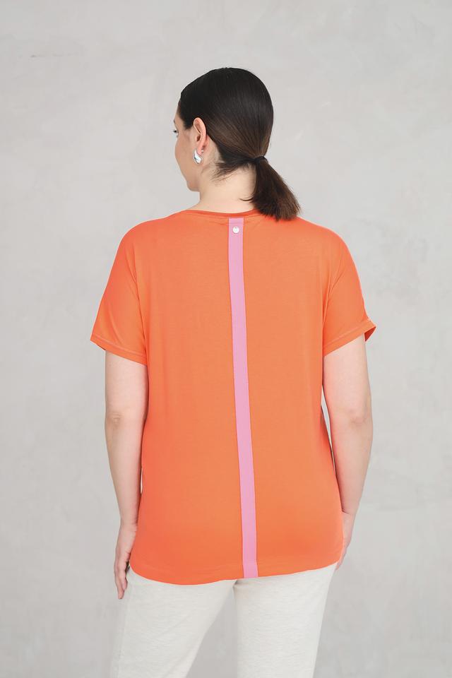 На спине футболки расположена вертикальная вставка розового цвета, добавляющая оригинальности дизайну. Эта модель идеально подойдет для создания повседневных образов, сочетаясь с джинсами, шортами или юбками. Состав ткани: 50% хлопок, 50% модал.