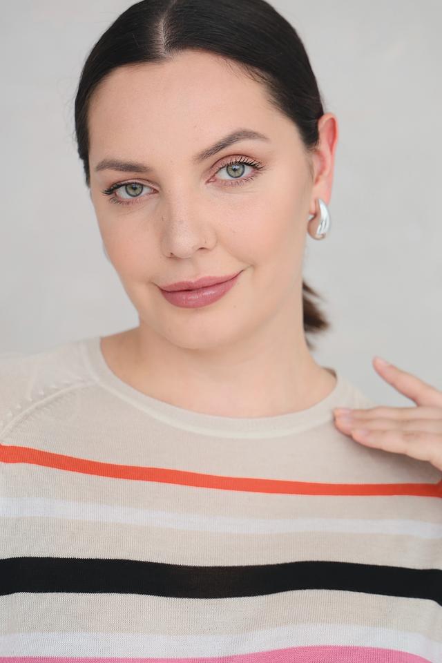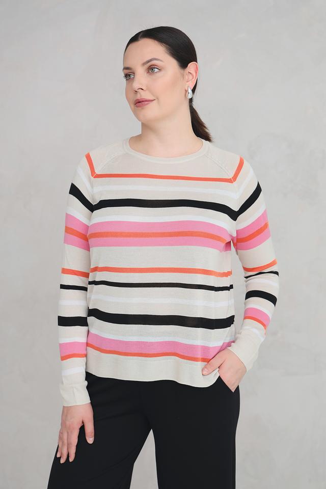 Этот стильный пуловер от Frapp выполнен в актуальной полосатой расцветке, сочетающей в себе бежевый, чёрный, розовый и оранжевый цвета. Он станет ярким акцентом в вашем образе и подчеркнёт вашу индивидуальность.