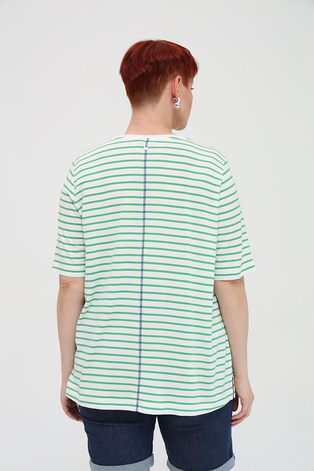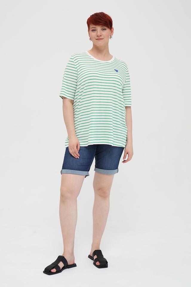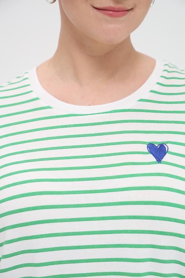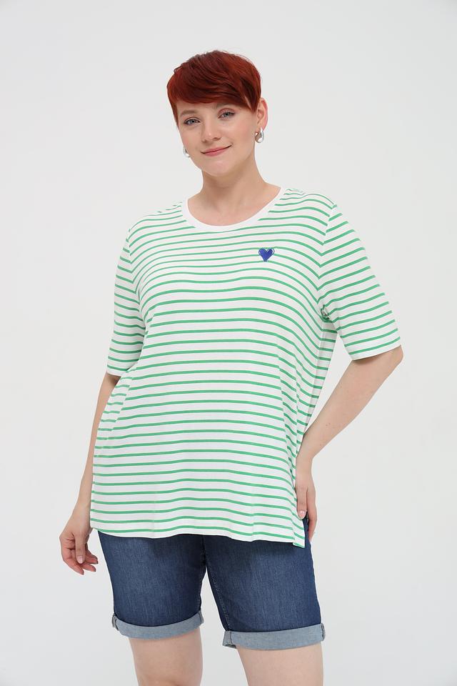 Женская футболка Frapp зеленого и белого цвета в полоску, украшена небольшим синим сердечком. Изготовлена из мягкой вискозы с добавлением эластана для комфорта и хорошей посадки. Состав: вискоза 90%, эластан 4%