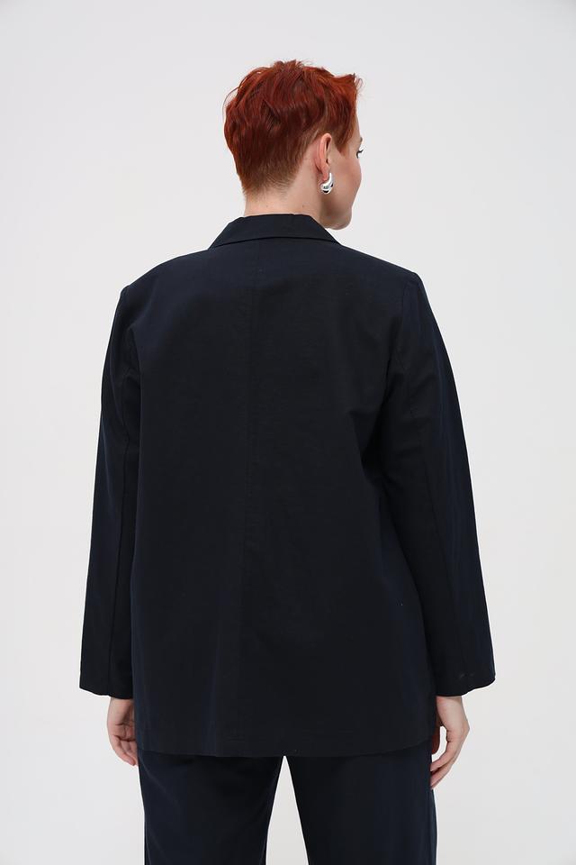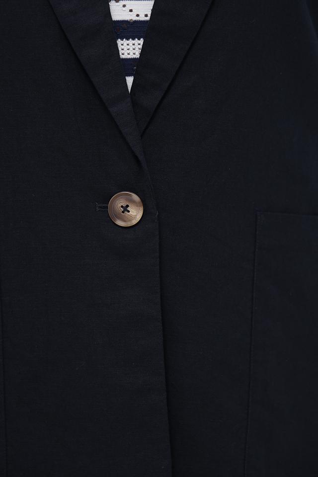 Тёмно-синий жакет Frapp прямого кроя станет отличным дополнением к вашему гардеробу. Модель выполнена из льна с хлопком, имеет лацканы, нагрудный карман и застежку на одну пуговицу. Состав: лен 55%, хлопок 45%