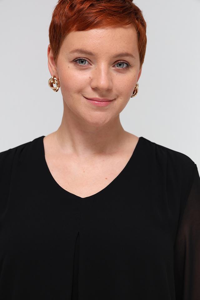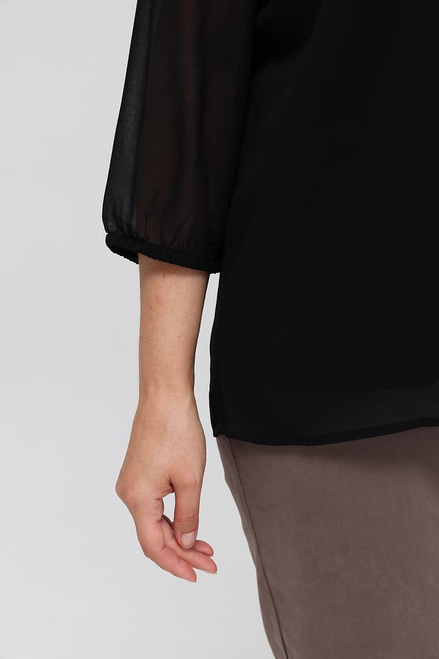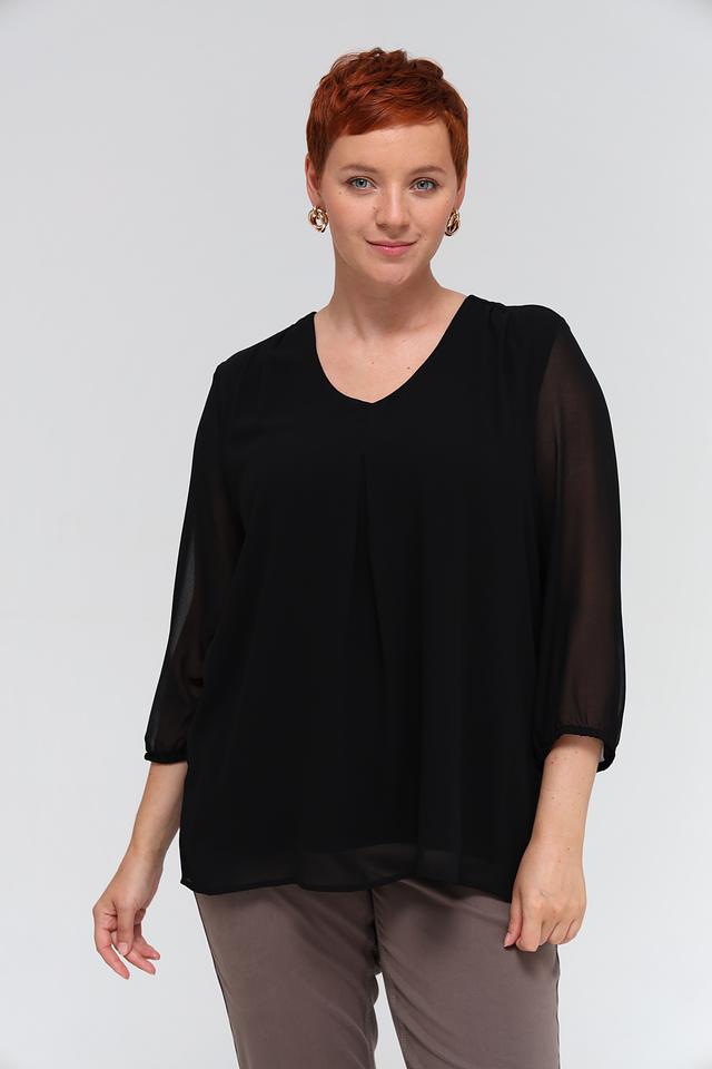 Чёрная блуза Frapp с рукавами-фонариками – элегантный выбор для создания женственного образа. Модель выполнена из лёгкой, полупрозрачной ткани и имеет V-образный вырез горловины. Состав: полиэстер 100%