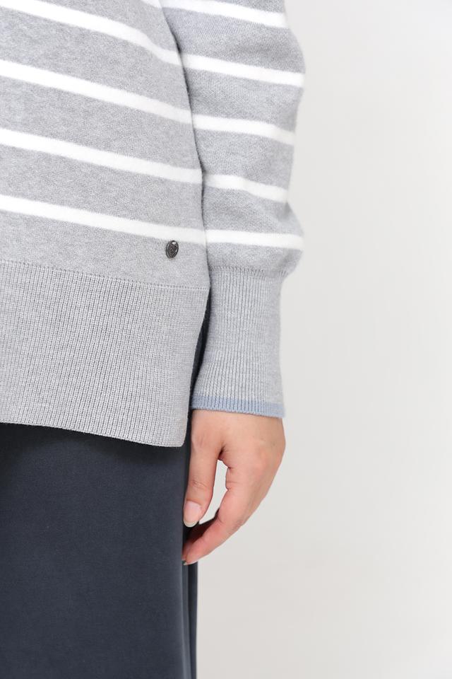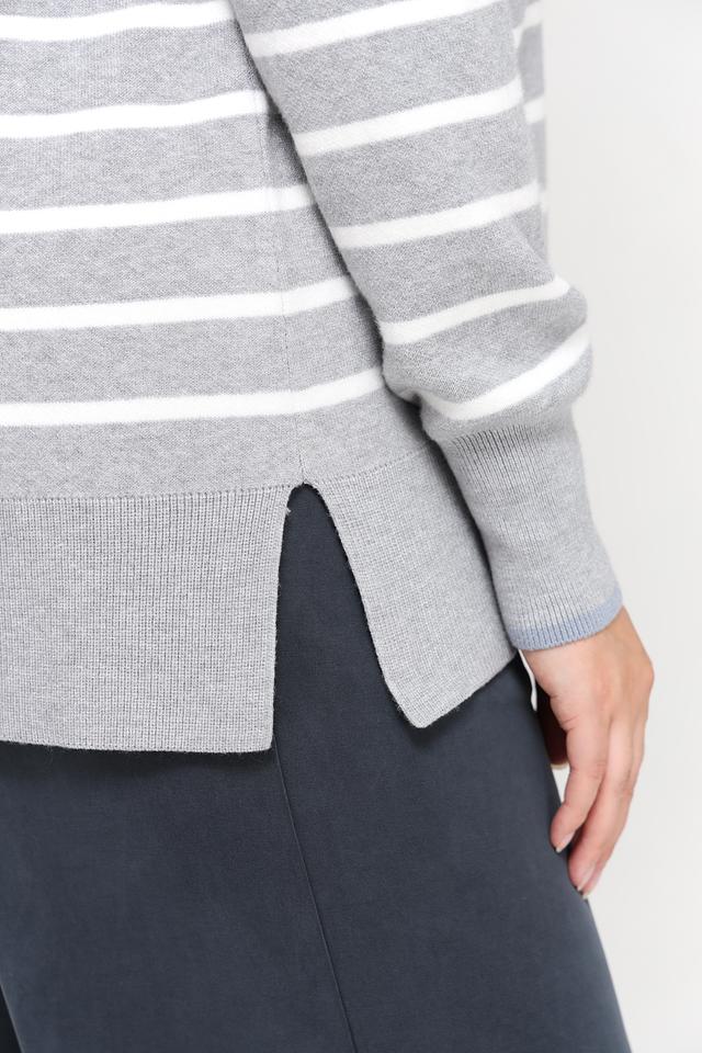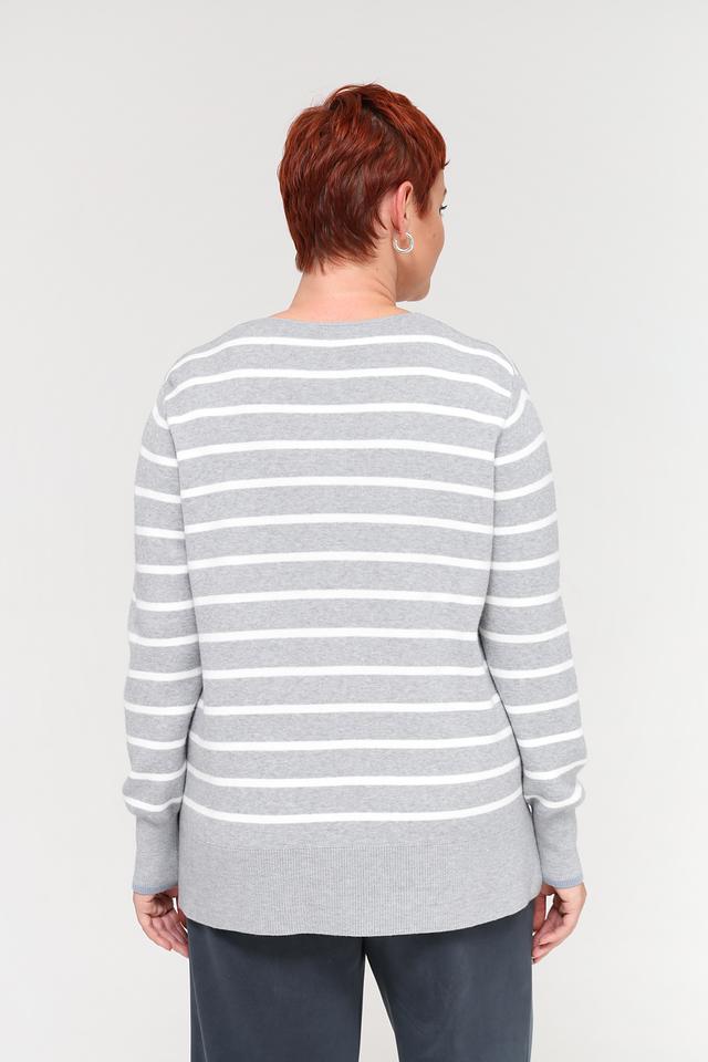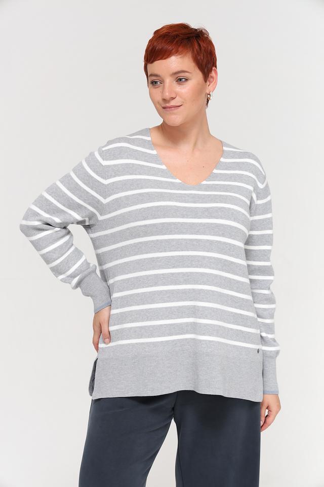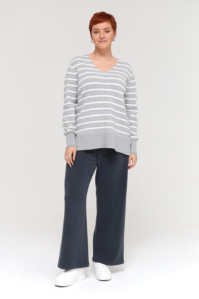 Этот пуловер от Frapp выполнен в классическом сером цвете с белыми полосами, что делает его универсальным дополнением к любому гардеробу. Модель имеет V-образный вырез и свободный, слегка заниженный силуэт, который обеспечивает комфорт в носке.