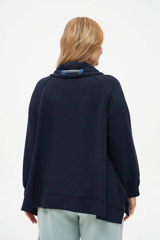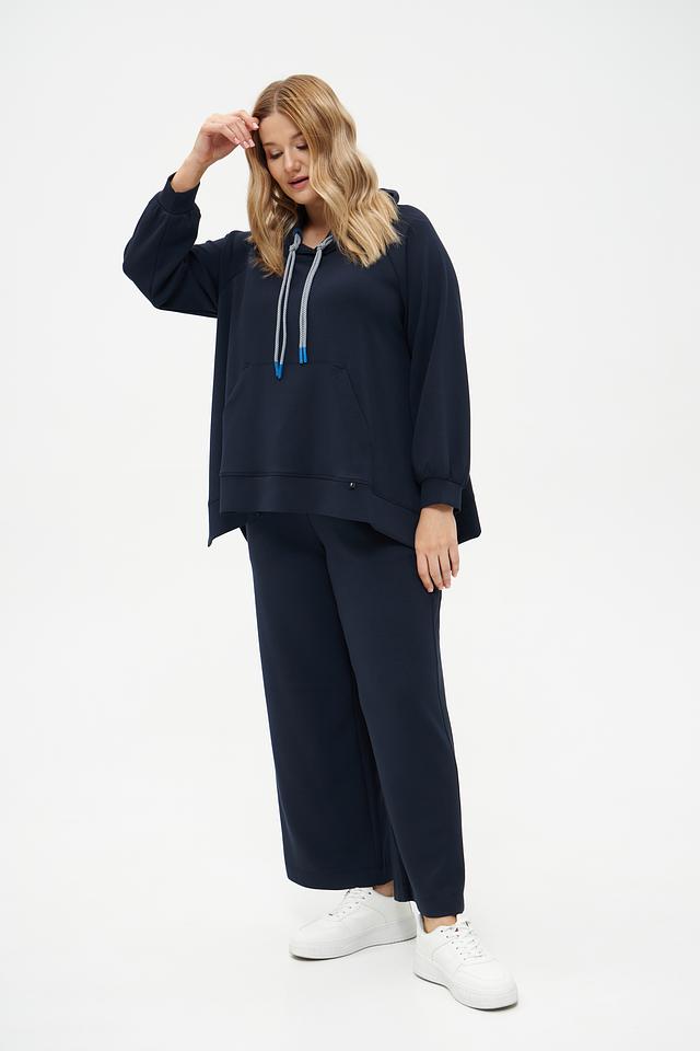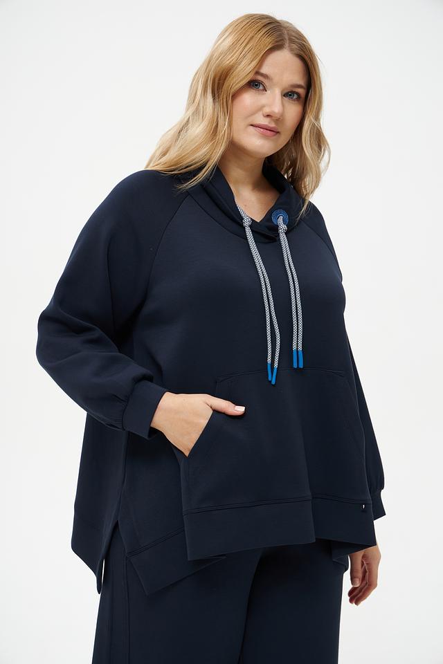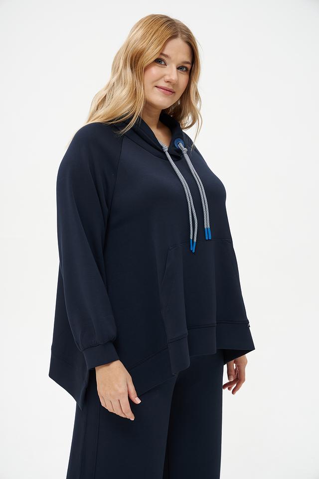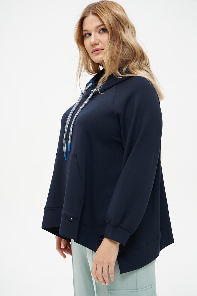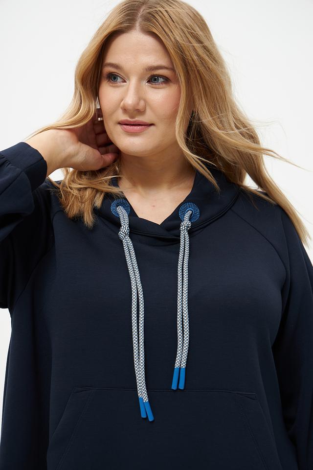 Тёмно-синий пуловер от Frapp с капюшоном и карманом – удобная и стильная модель для повседневной носки. Свободный крой и мягкий материал обеспечивают комфорт, а оригинальные шнурки на капюшоне добавляют образу изюминку. Состав: вискоза 49%, полиэстер 43%, эластан 8%