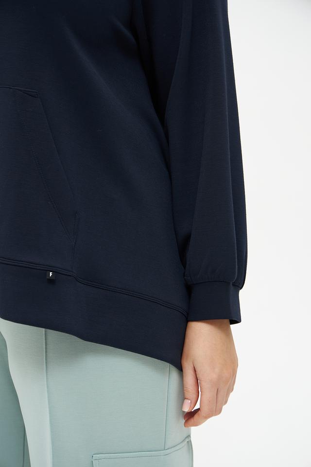 Пуловер имеет свободный крой, который не сковывает движения и обеспечивает комфорт в течение всего дня. Капюшон со шнурками позволяет регулировать степень защиты от ветра и холода. Накладной карман добавляет функциональности и практичности.