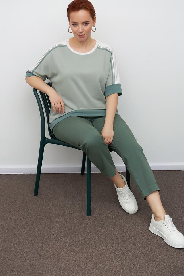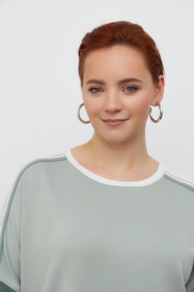 Стильный пуловер Frapp мятного цвета с контрастными полосками на рукавах и горловине. Изготовлен из мягкой вискозы с добавлением полиамида и эластана для комфорта и хорошей посадки. Состав: вискоза 48%, полиамид 45%, эластан 7%