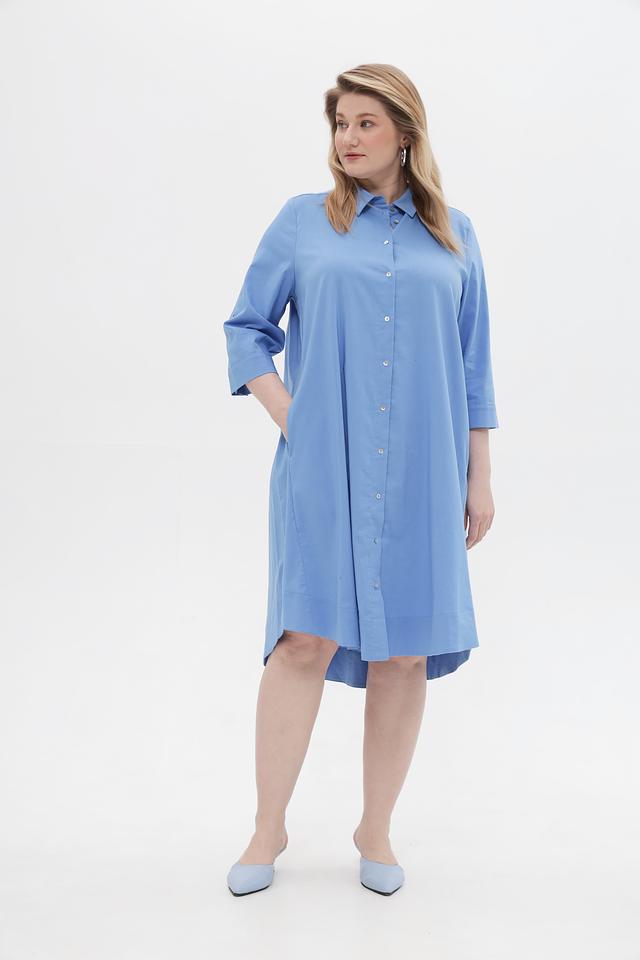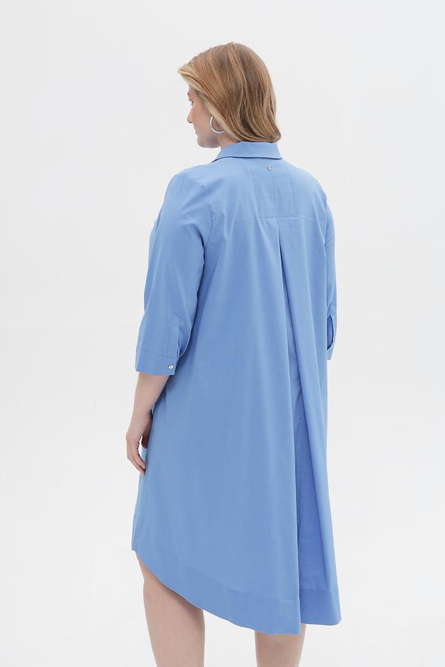 Модель имеет прямой силуэт, воротник рубашка и застегивается на пуговицы по всей длине. Рукава длиной 3/4 с манжетами, которые можно регулировать при помощи пуговиц. Платье имеет асимметричный подол, который придает образу динамичность.