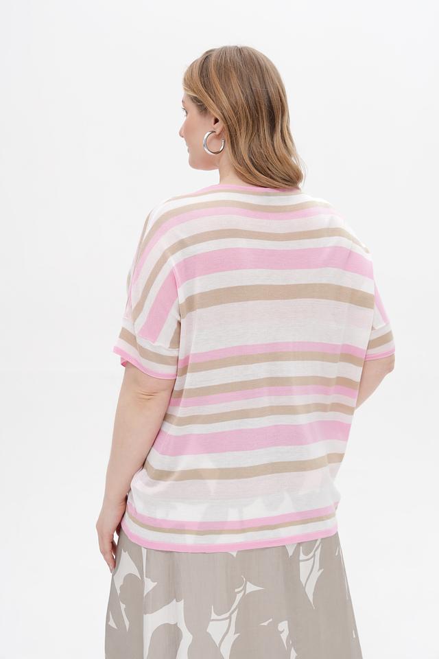 Этот стильный пуловер от Frapp станет отличным дополнением к вашему гардеробу. Модель выполнена в горизонтальную полоску, сочетающую нежно-розовые, бежевые и кремовые оттенки.