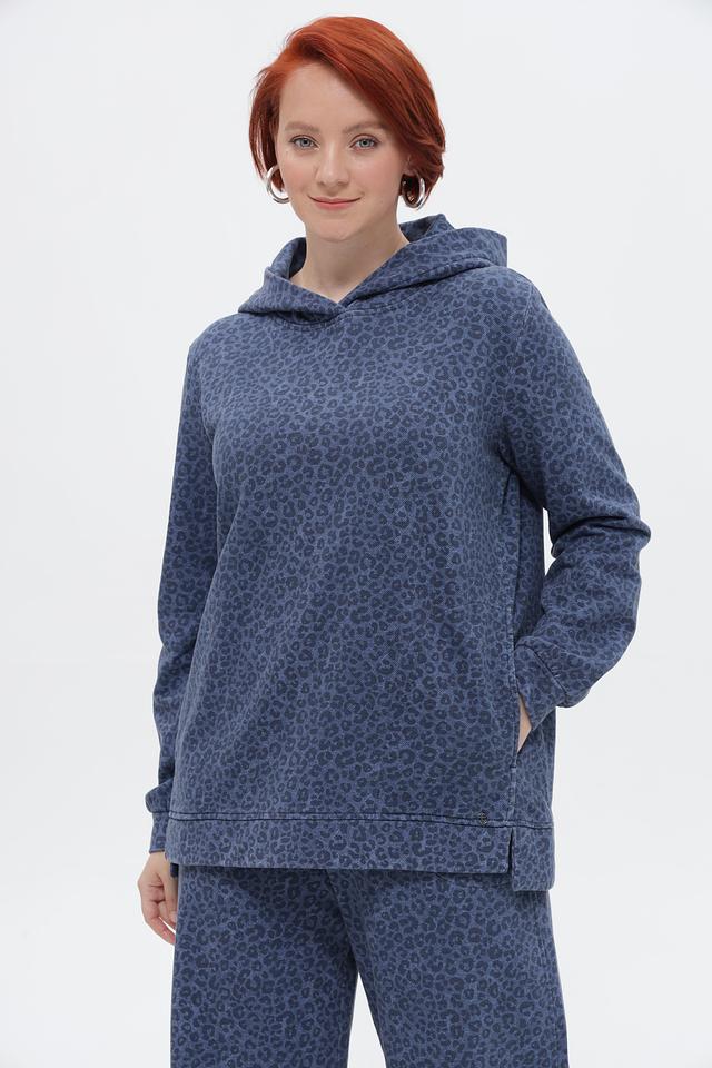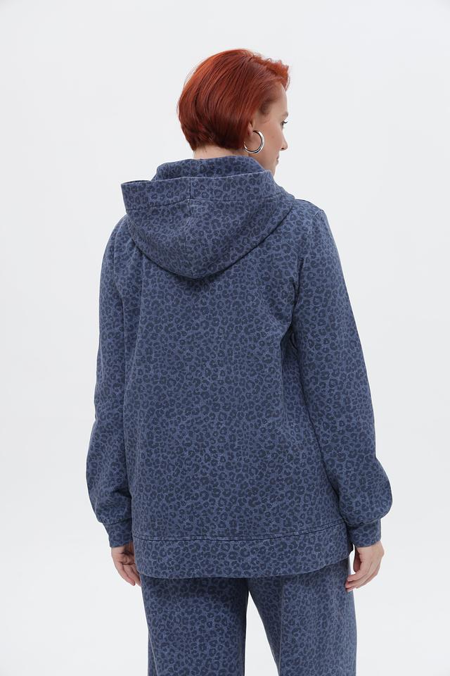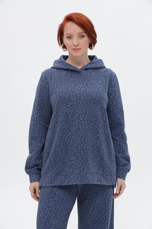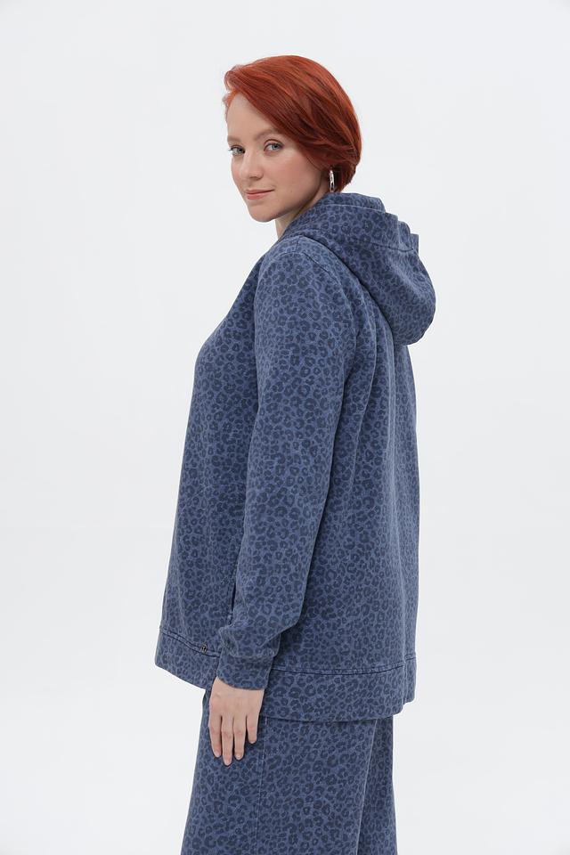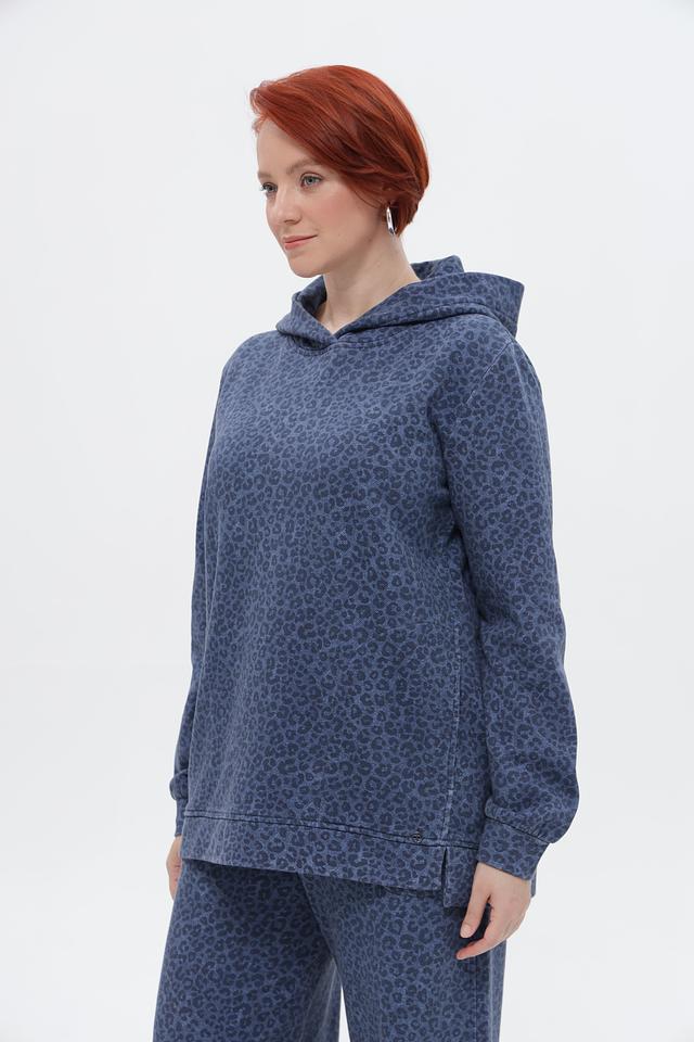 Этот стильный пуловер от Frapp выполнен в синем цвете и украшен эффектным леопардовым принтом. Модель имеет свободный крой, капюшон и длинные рукава, что делает ее удобной и практичной для повседневной носки.