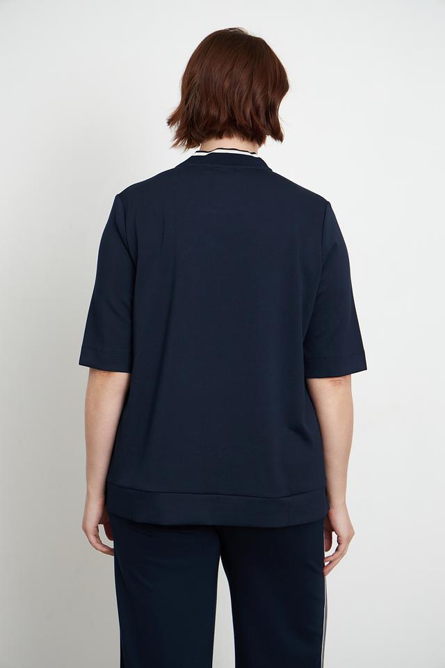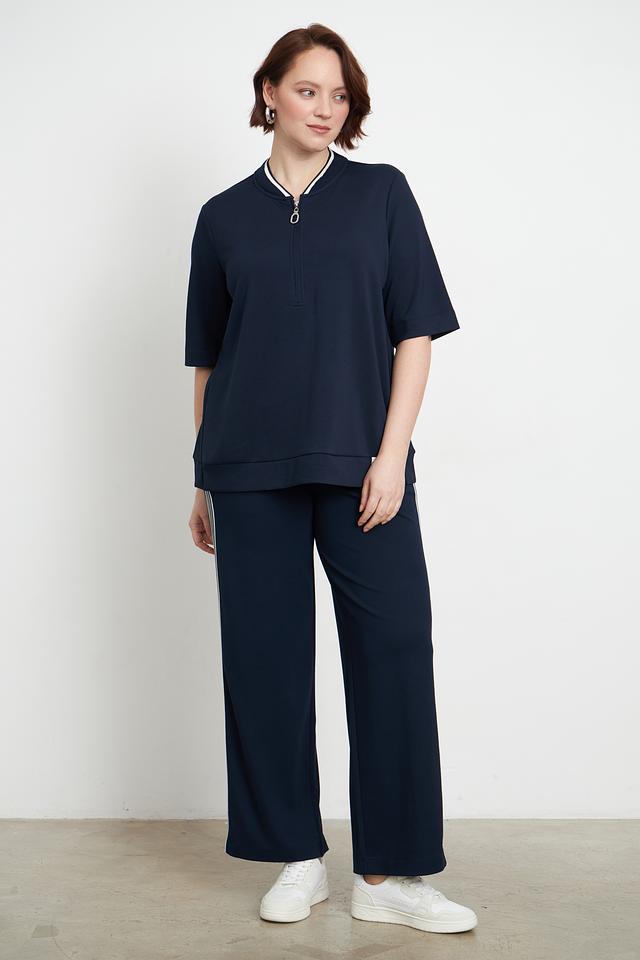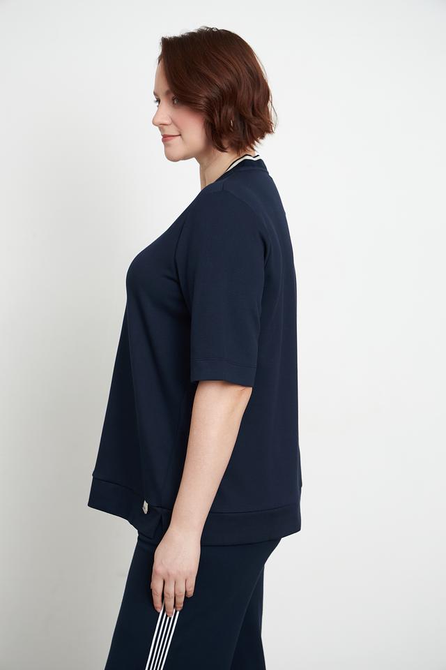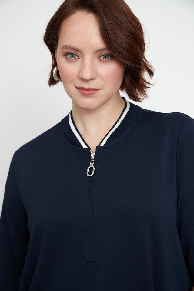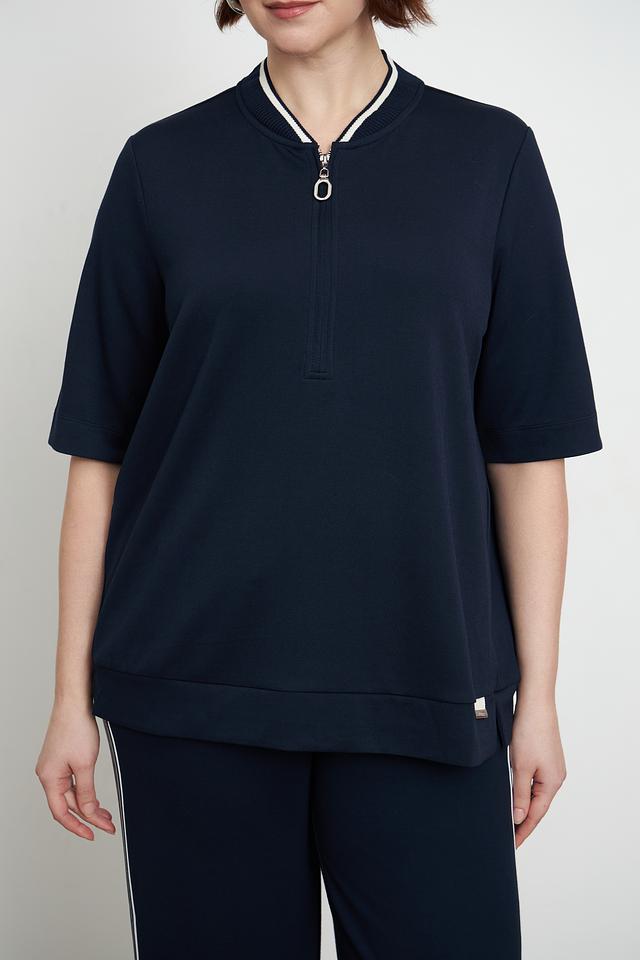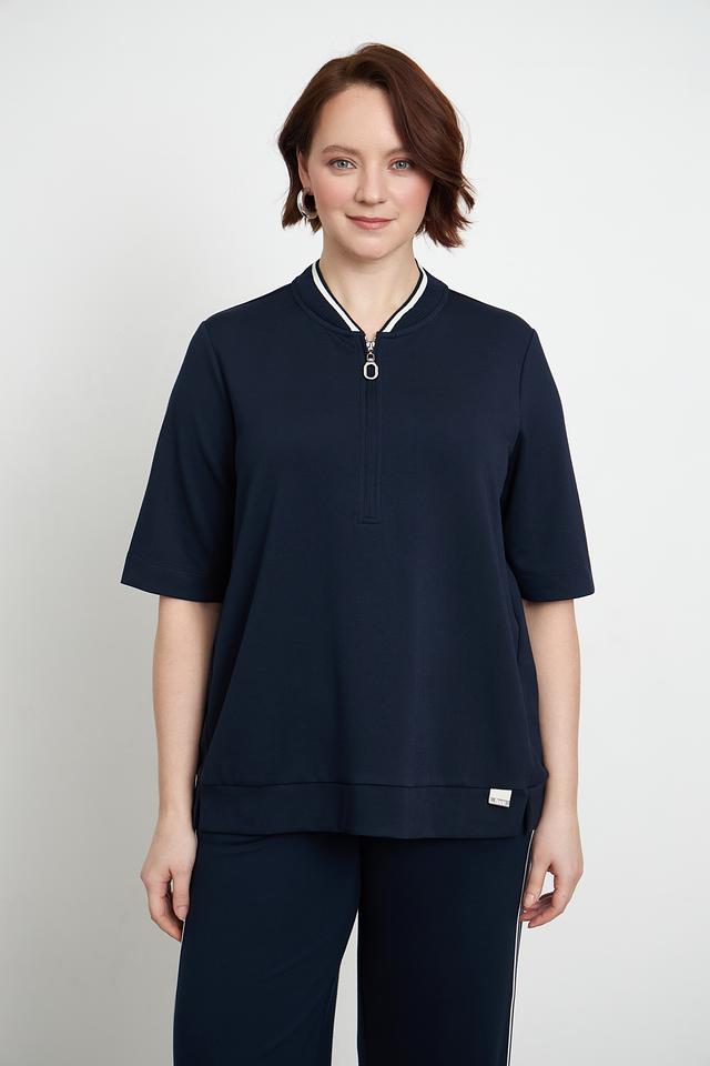 Пуловер имеет удобную посадку, короткие рукава и аккуратную молнию на горловине, которая добавляет изюминку дизайну. Декоративная белая полоска вдоль молнии и на манжетах придает модели завершенный вид.