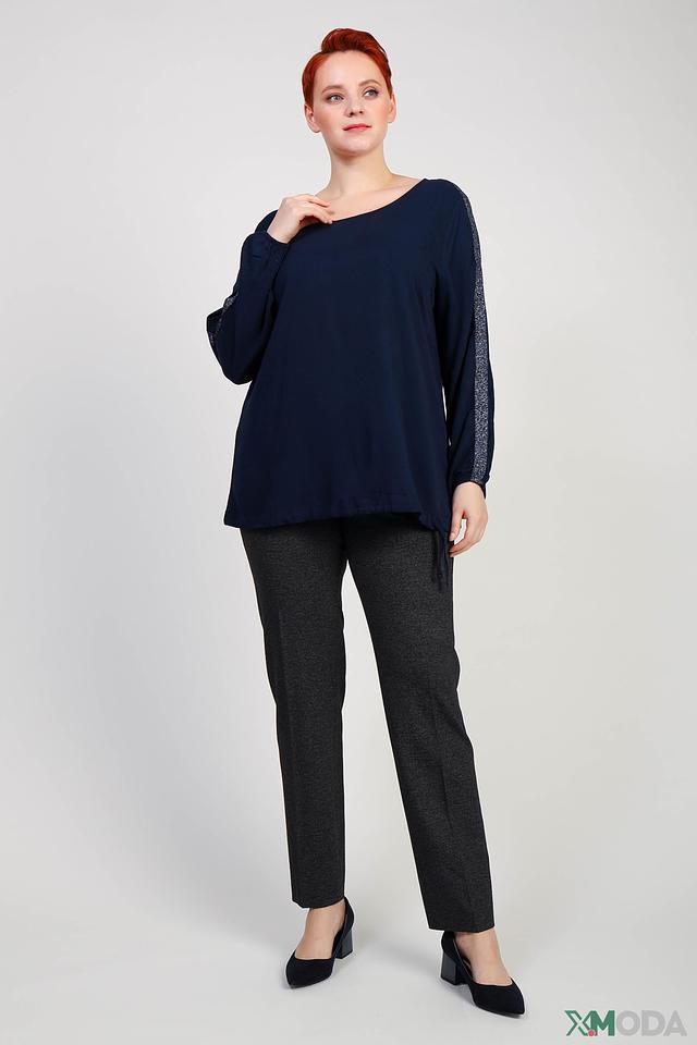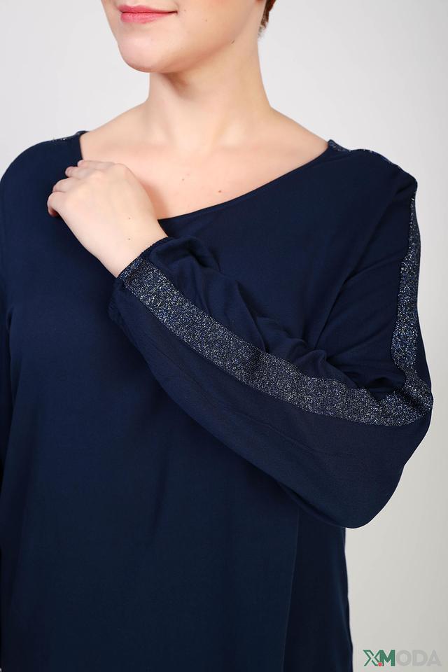Особенностью данной модели являются рукава, декорированные блестками, добавляющими образу праздничности и изысканности. Блуза имеет свободный крой, который не сковывает движений и позволяет создать расслабленный силуэт.