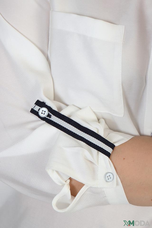 Блуза имеет свободный крой, который обеспечивает комфорт в носке. На груди расположены два накладных кармана, добавляющие образу непринужденности. Рукава блузы длинные, с манжетами, украшенными контрастными полосками в тёмно-синем и белом цветах.