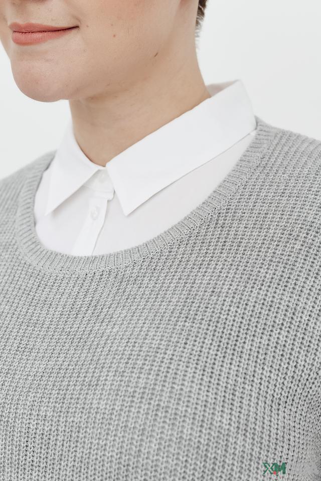 Жилет имеет прямой крой и круглый вырез горловины. Отсутствие рукавов делает его идеальным для создания многослойных образов в тёплую погоду или в помещении. Текстура вязки добавляет изделию объём и визуальный интерес.